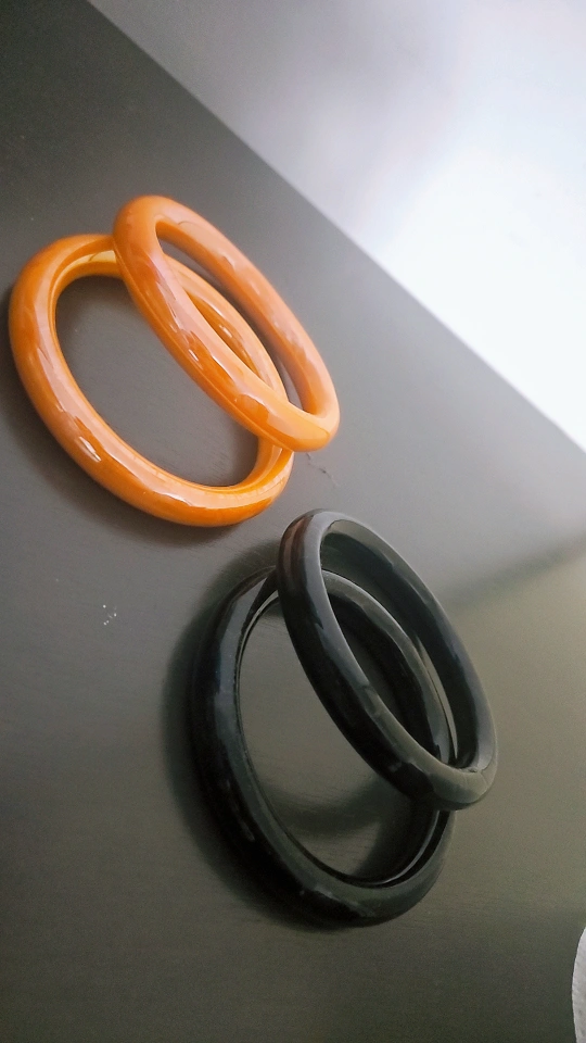 Selling a set of bangle. There are two orange and two black bracelets. They're in good condition and would make a great addition to any outfit!