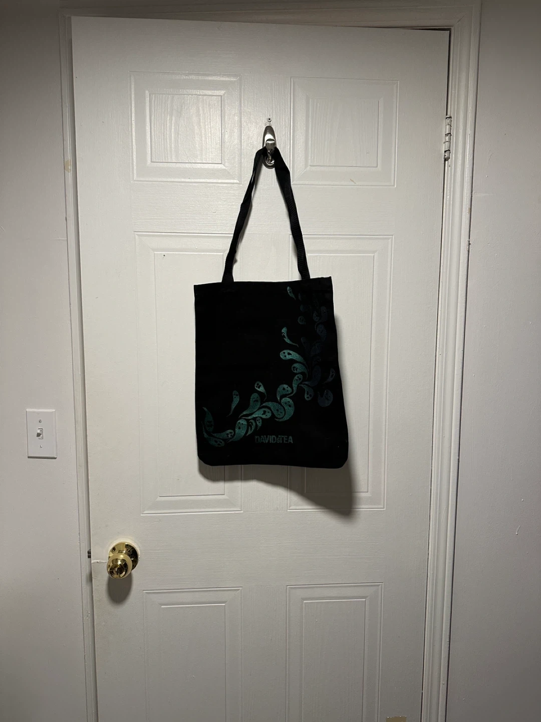 Selling a DAVIDsTEA black tote bag. It's in great condition and perfect for carrying your tea and other essentials!