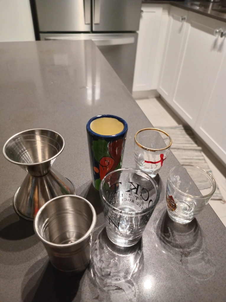 Selling a set of six assorted shot glasses! There's a variety of styles, from stainless steel to decorative glass. Perfect for adding some fun to your home bar or for a party