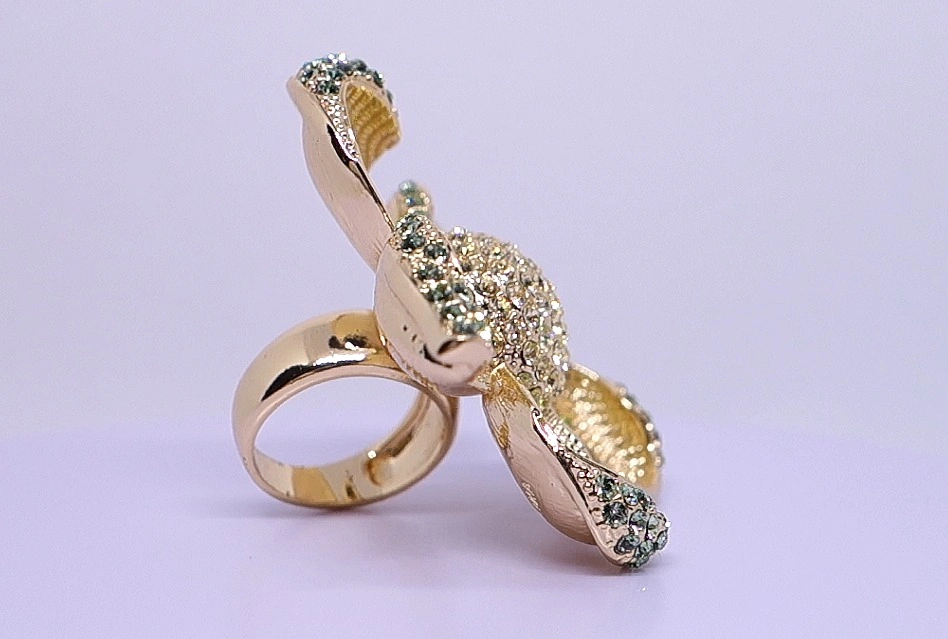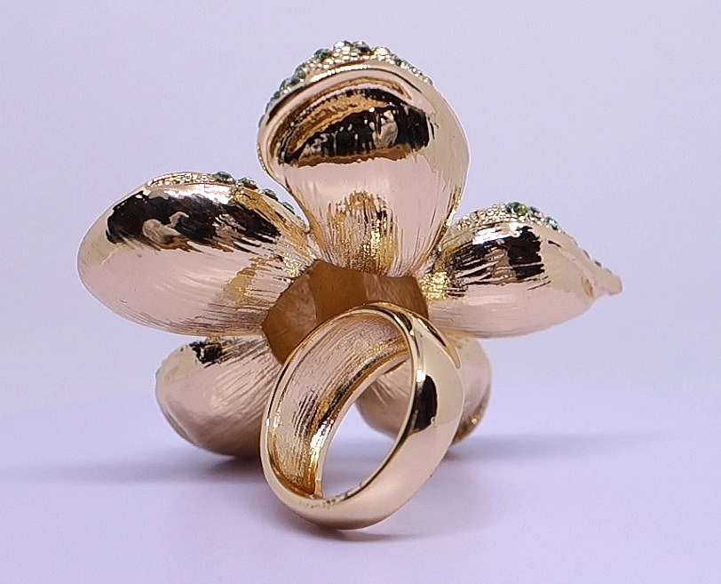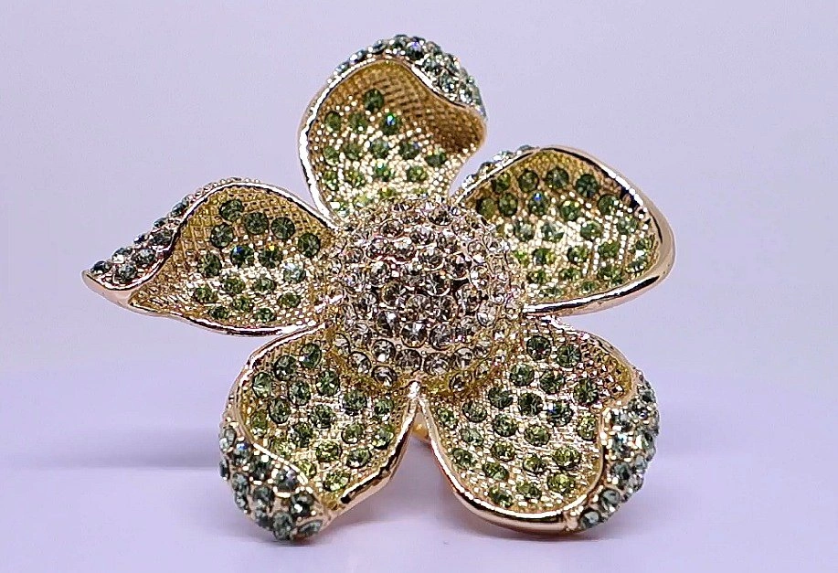 If you love flowers, nature and everything beautiful and want everyone to know it, then this ring is for you! This is a one of a kind design, three-dimensional green and clear multi-crystal "pave" style fashion statement ring. The ring measures approximately 2" across. Everywhere you look, there is a new detail to be admired. Definitely a feel-good ring that you'll want to wear everyday and show off to your friends.