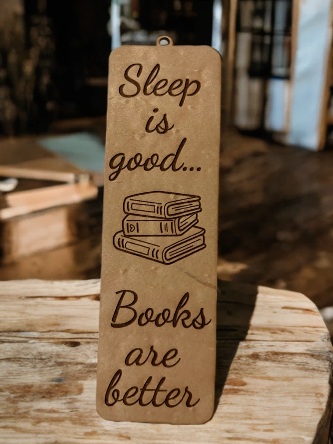 Check out these unique handmade wooden bookmarks! Each one features a different design: a tree, a bee with honeycomb, a mountain range, and a stack of books with the saying 'Sleep is good... Books are better' Perfect for any book lover! For a extra fee I can engrave a name on the back!