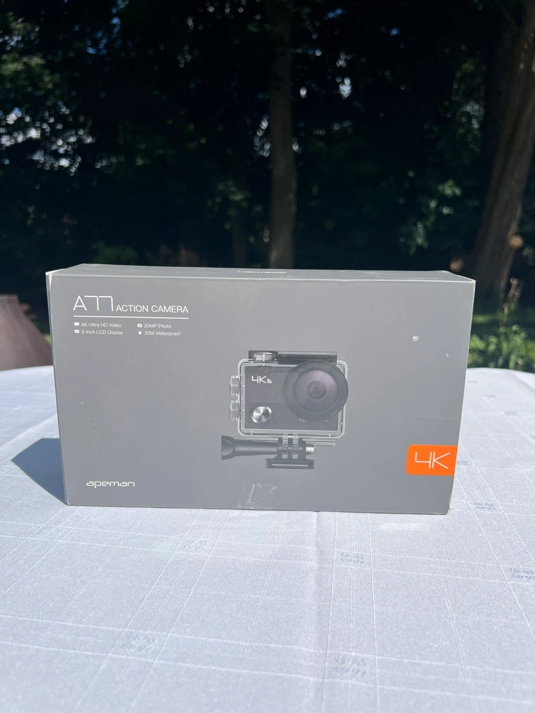 Selling an Apeman A77 action camera. It's in like-new condition and comes with its original box. Key features include: - 4K Ultra HD video recording - 20MP photos - 2 inch LCD display - 30M waterproof