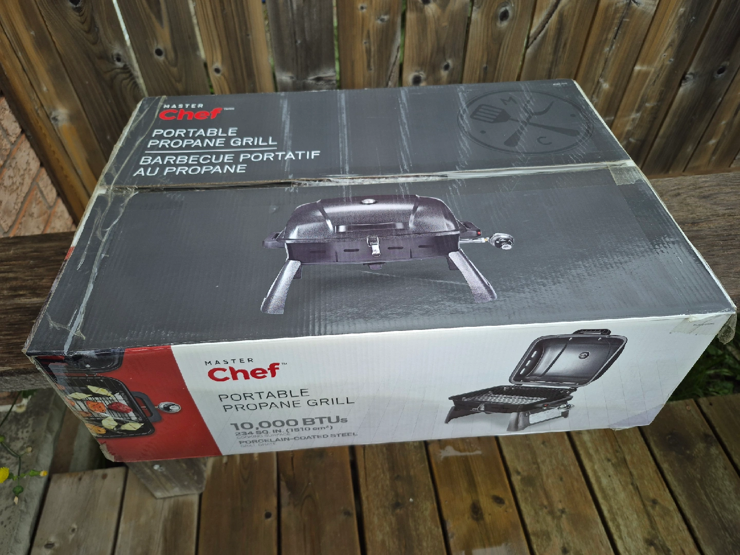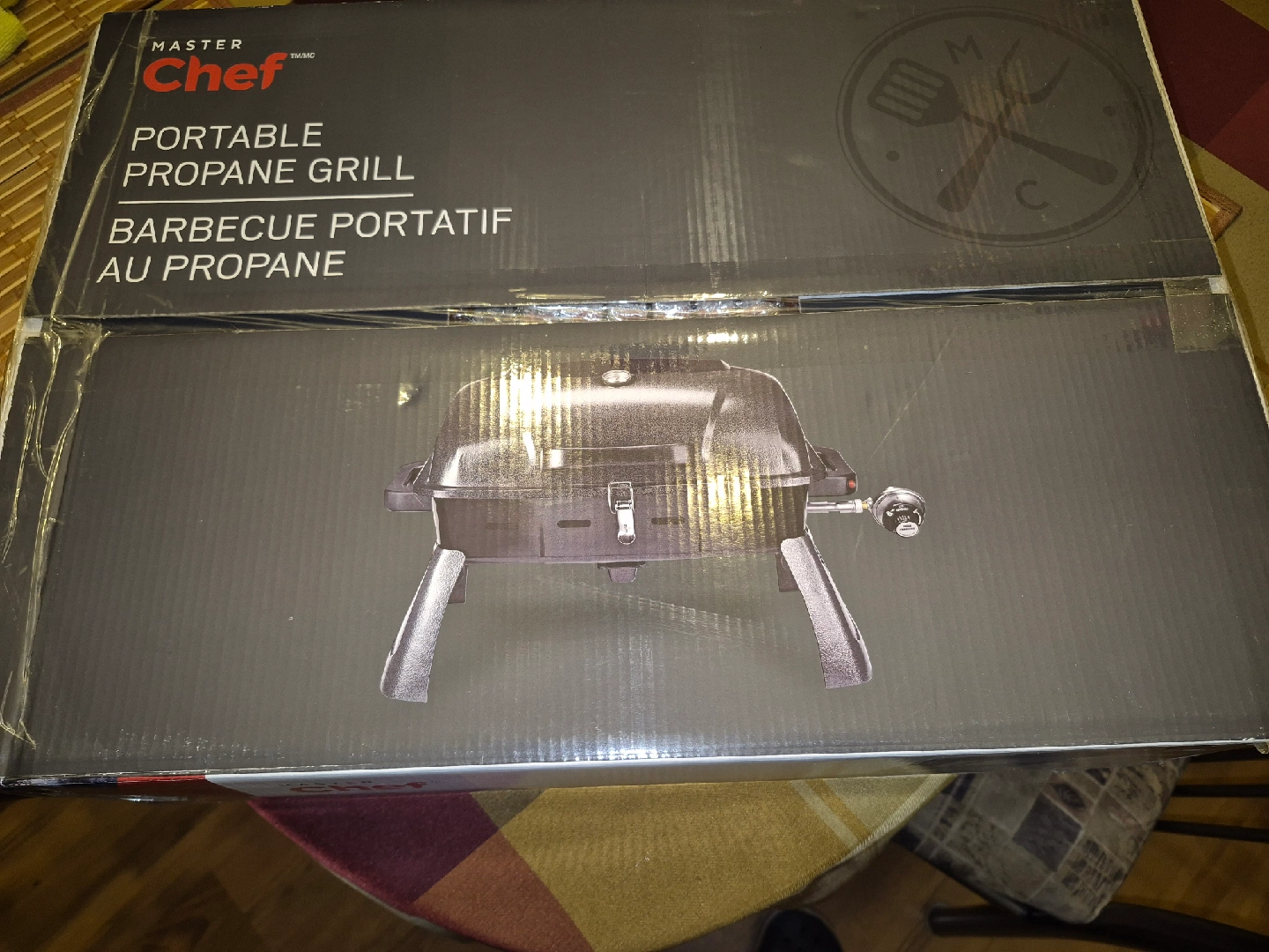 Selling a brand new Master Chef portable propane grill, still in its original box! It's perfect for small spaces or taking on the go. This grill features: - 10,000 BTUs - 234 sq in cooking surface - Porcelain-coated steel construction Ready for all your grilling adventures!