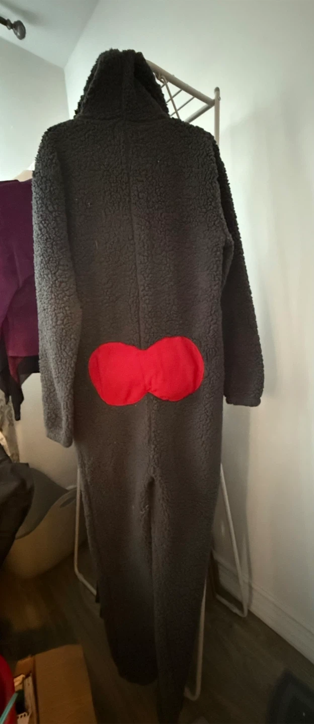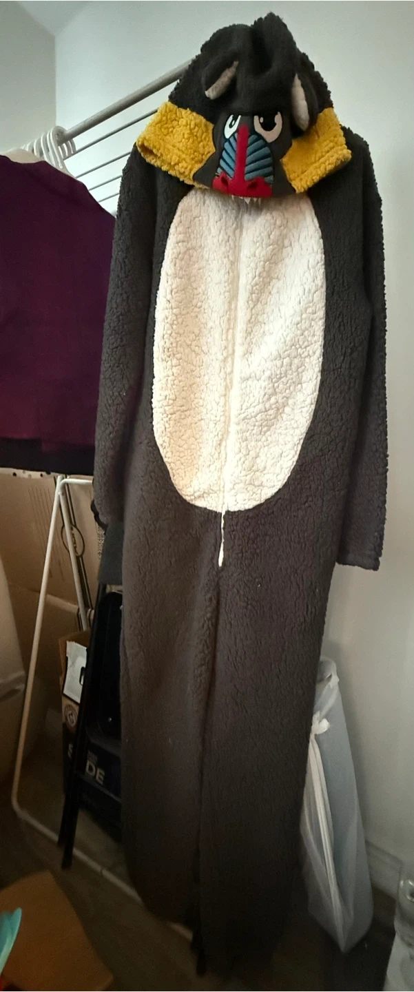 Cozy up in this Bluenotes animal onesie! It's a fun and comfortable piece, perfect for lounging around at home. This onesie features a mandrill design with a hood and a front zipper. It's made of a soft, plush material to keep you warm and snuggly!