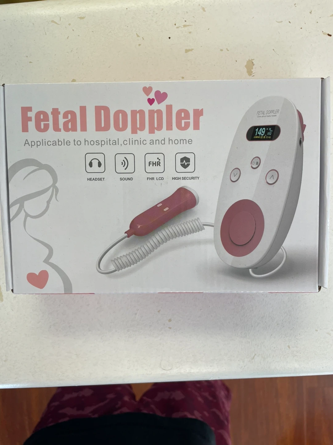 Fetal Doppler for monitoring baby's heartbeat at home. It's applicable to hospital, clinic and home use. Comes with headset for sound and FHR LCD display for high security