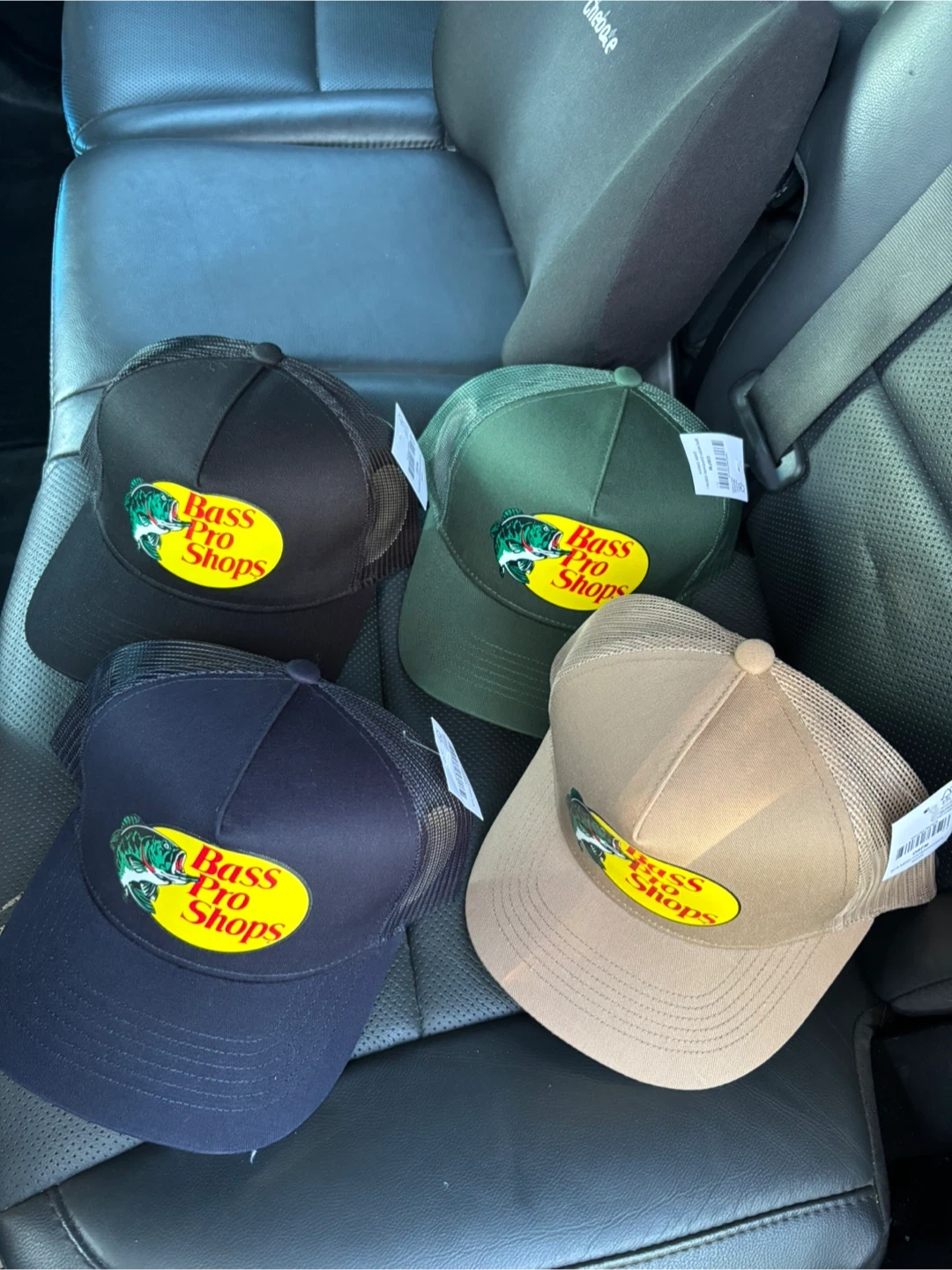 I have a few Bass Pro Shops trucker hats available in different colours! They're all in great condition and ready for a new home. Perfect for fishing, camping, or just everyday wear! Black,Navy,Beige,Green