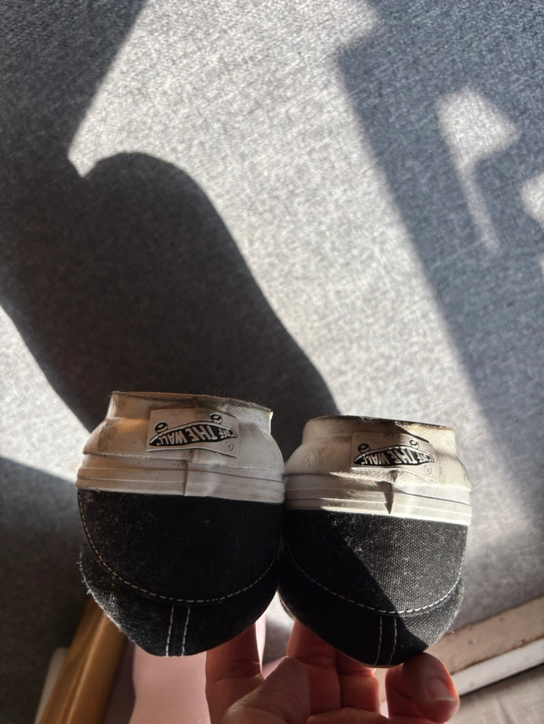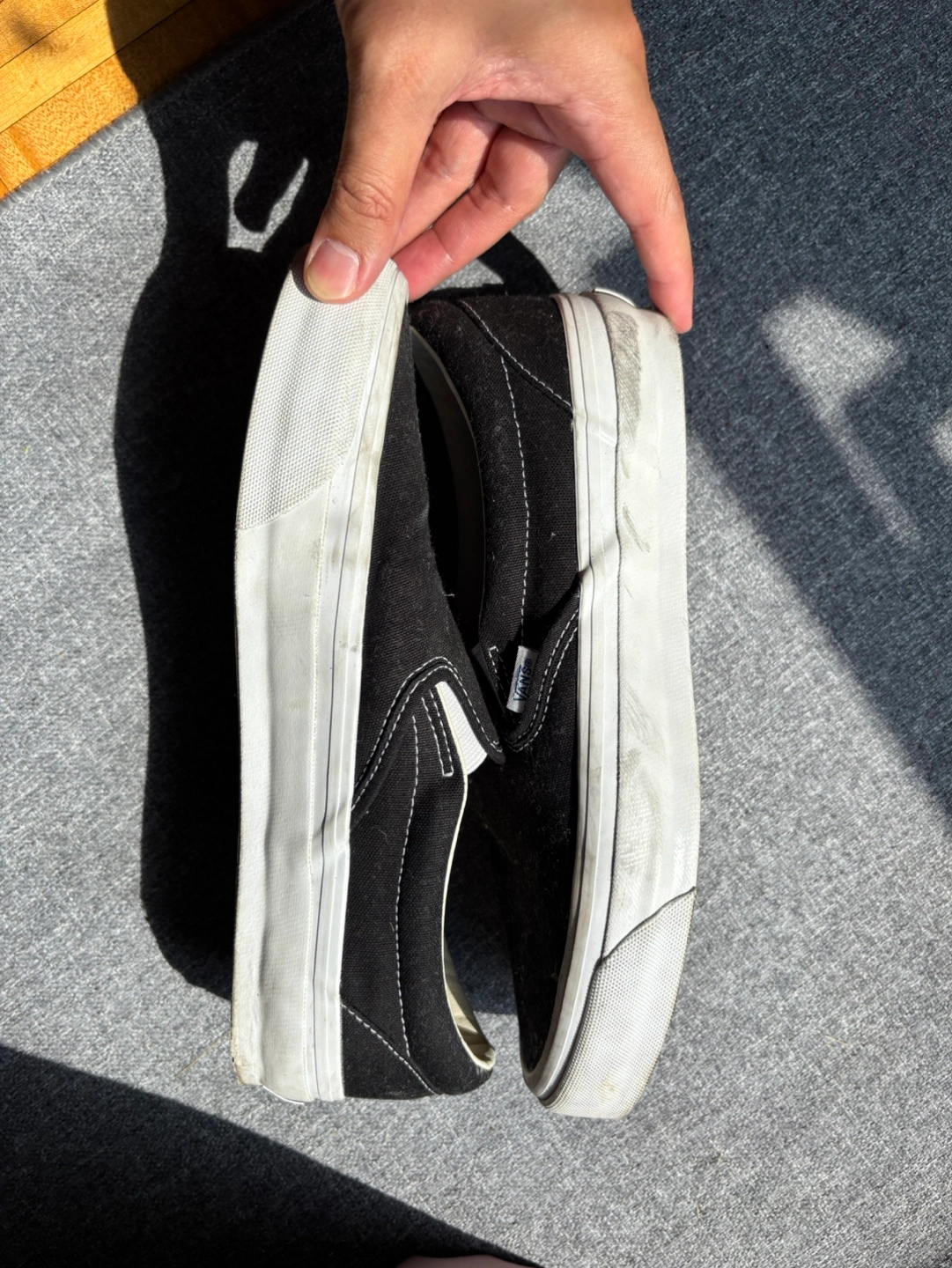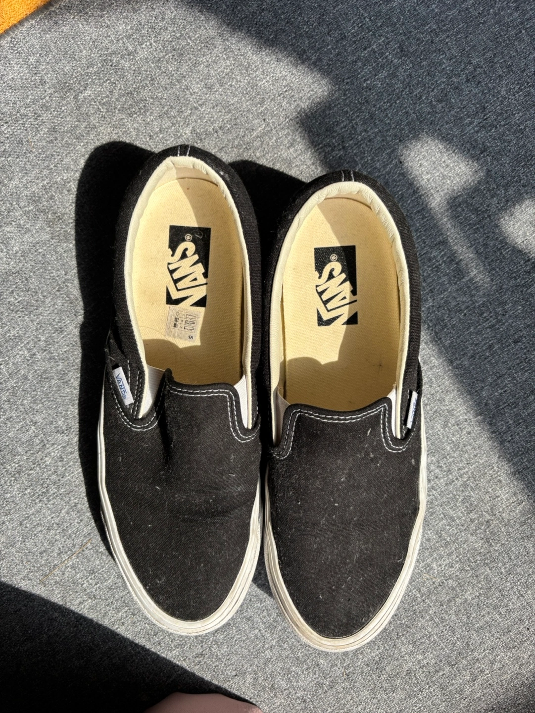 Selling a pair of Vans slip-on shoes in black. They're in used condition, as you can see in the photos. Size 8.5 US