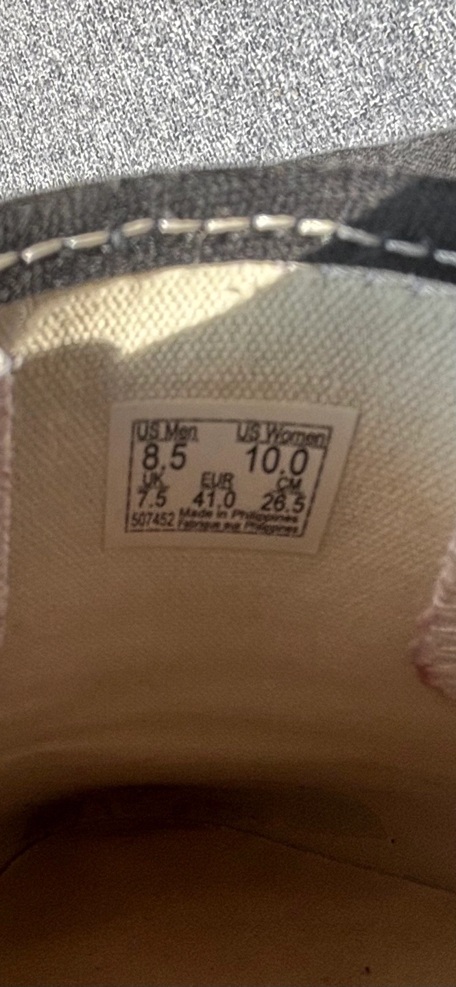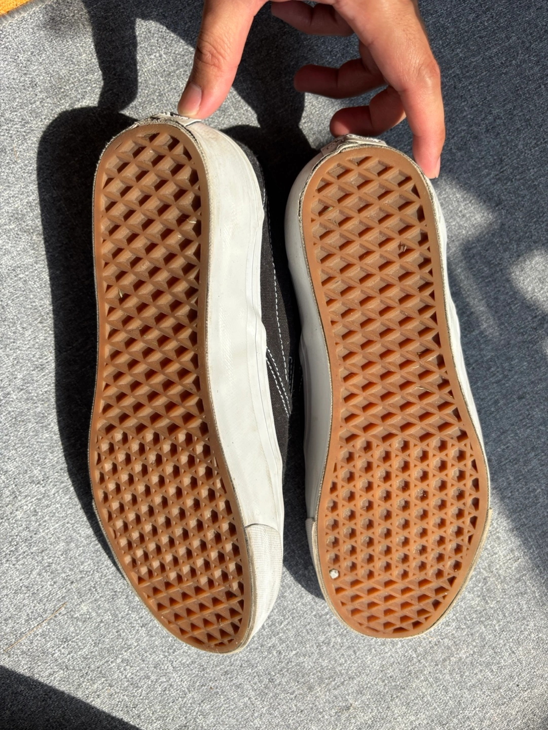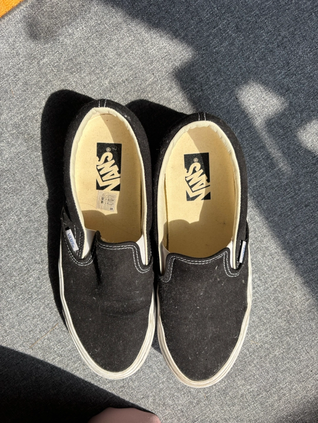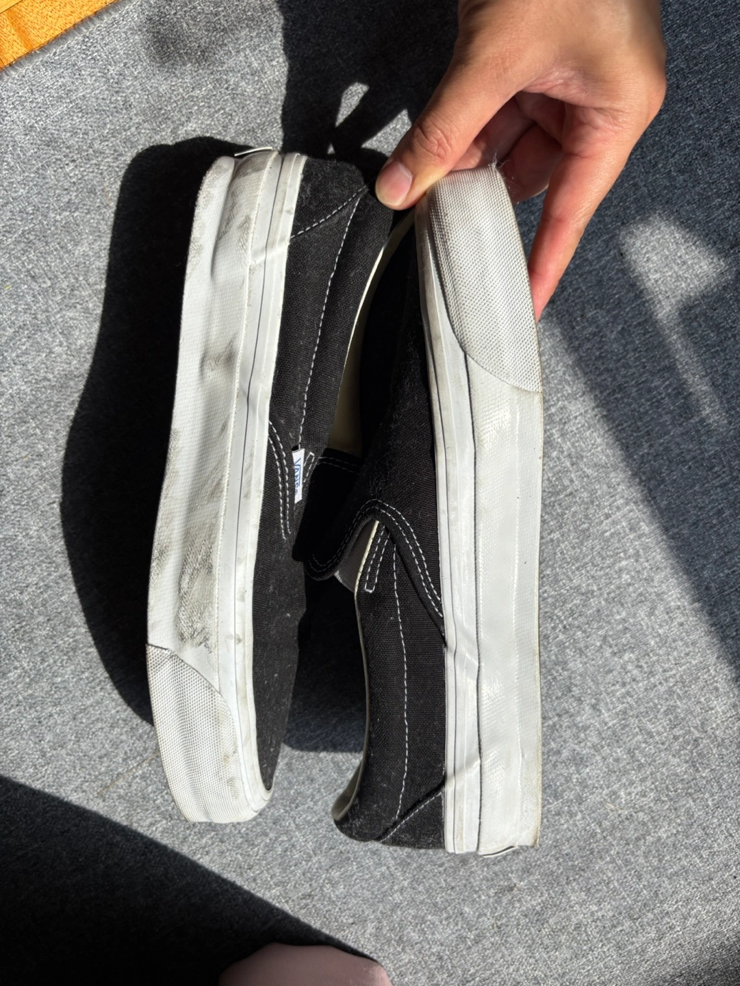 Selling a pair of Vans slip-on shoes in black. They're in used condition, as you can see in the photos. Size 8.5 US