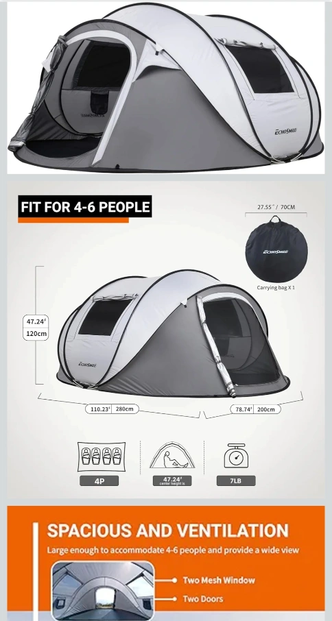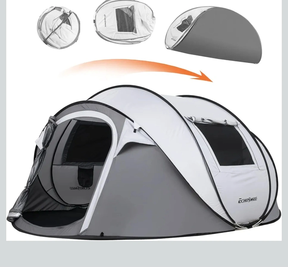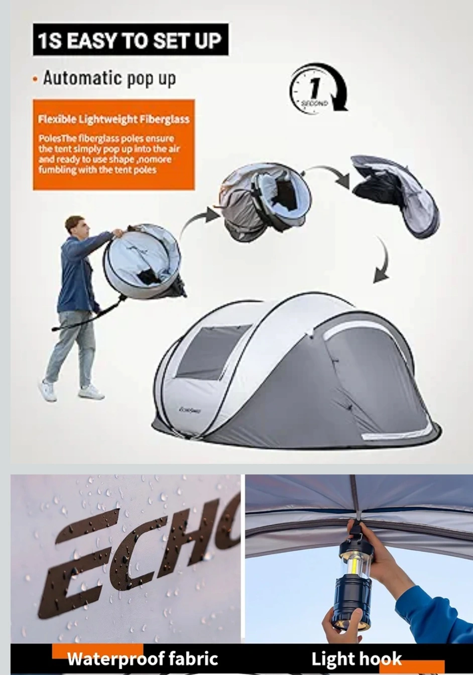 Looking to sell this Echosmile pop-up tent! It's in great shape and perfect for camping trips. - Fits 3 people comfortably - Automatic pop-up design for easy setup - Includes a carrying bag for convenient storage and transport - Features two mesh windows and two doors for ventilation - Lightweight fiberglass poles - Waterproof fabric