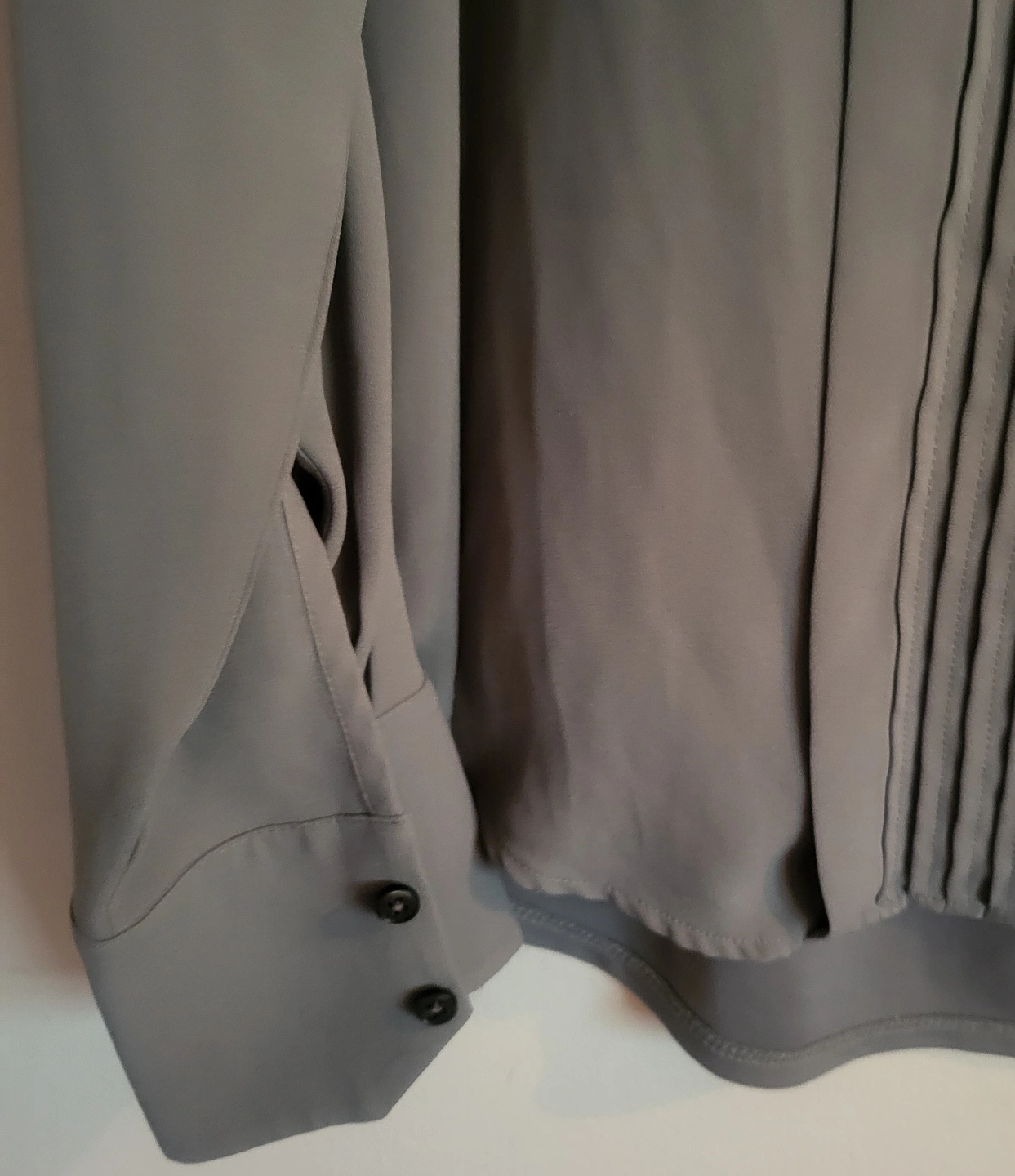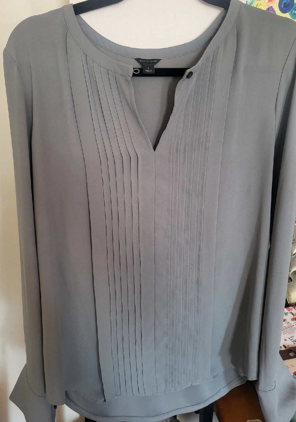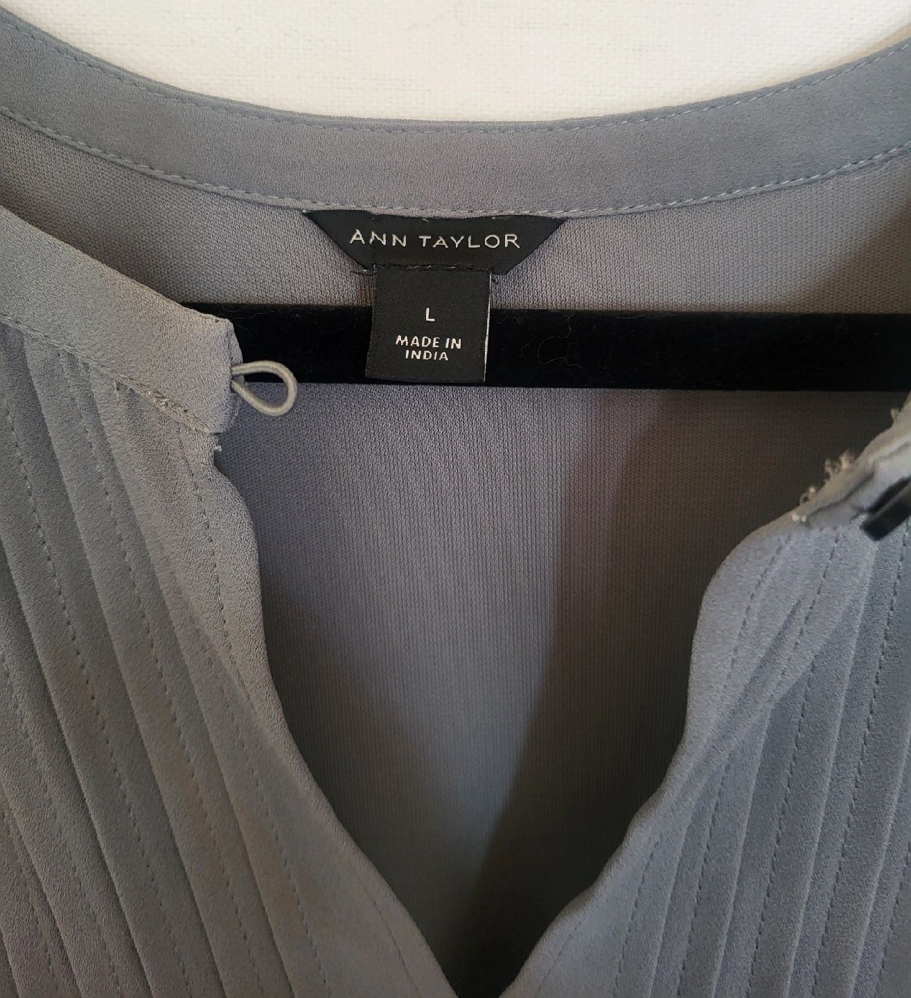 Selling a lovely Ann Taylor blouse in a beautiful light teal colour. It's a size L and in great condition! The blouse features a stylish pleated design.
