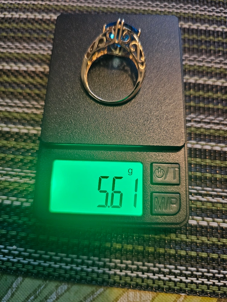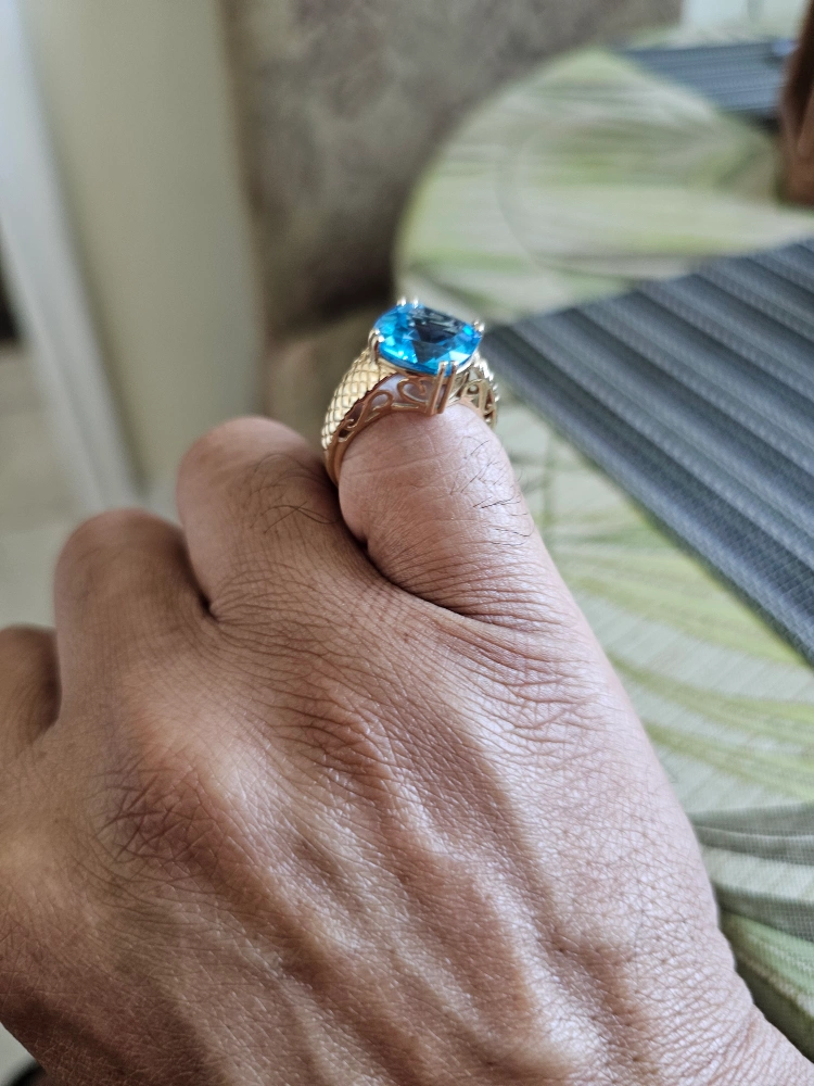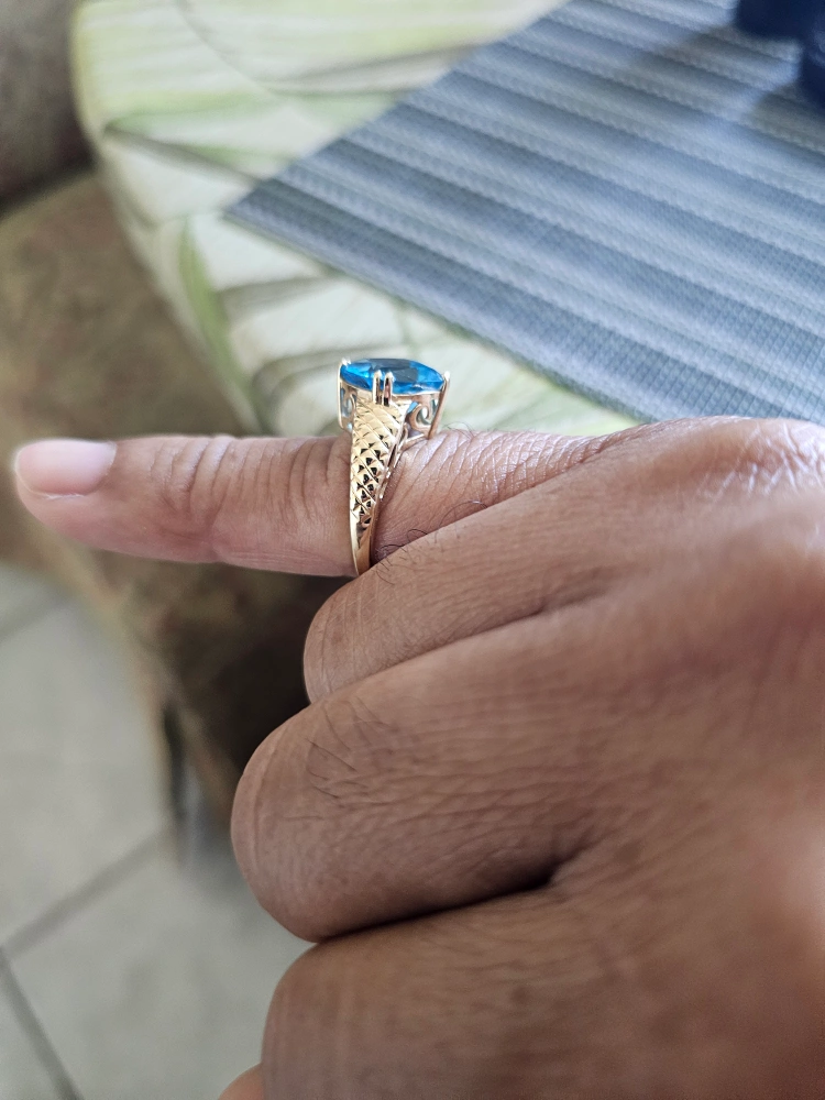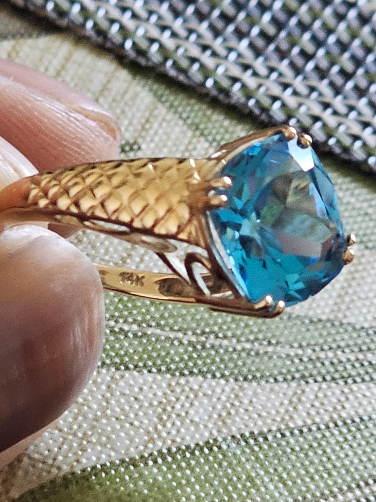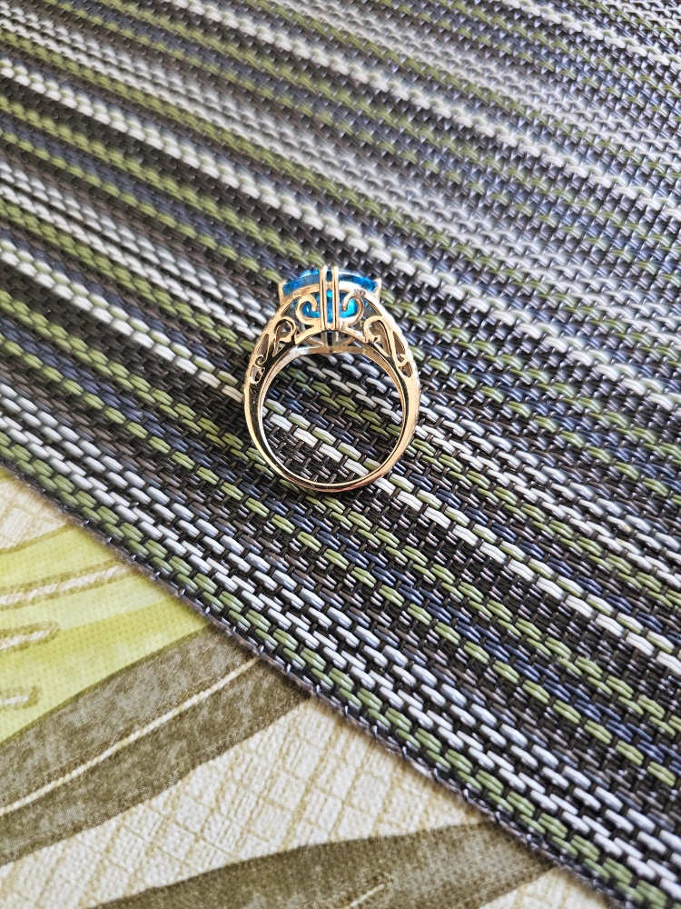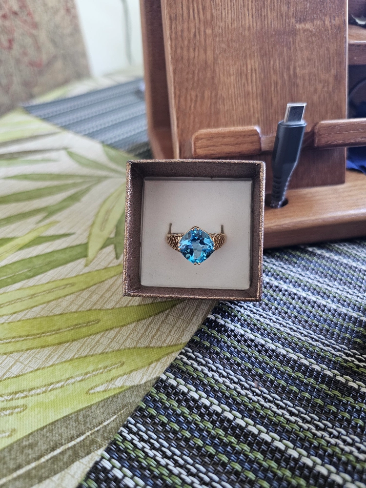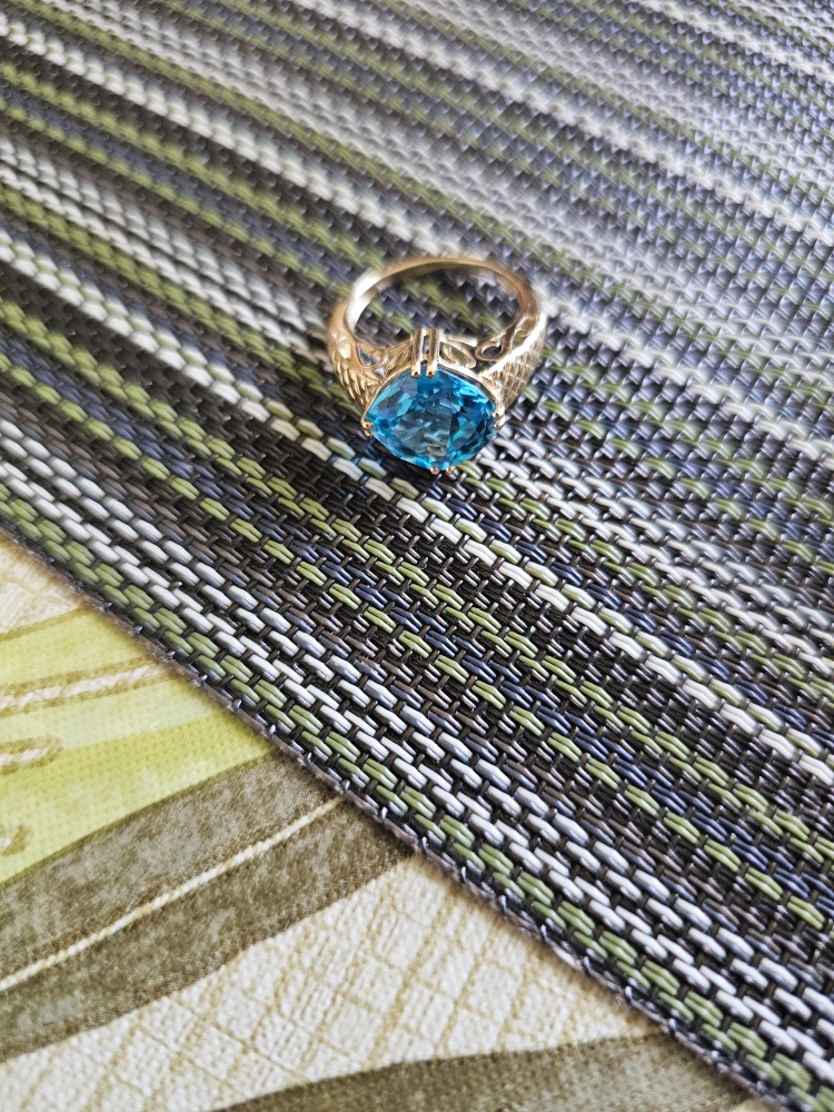 Selling a beautiful 14K gold ring featuring a stunning blue topaz stone. It comes in a box for safekeeping. This ring is sure to add a touch of elegance to any outfit!