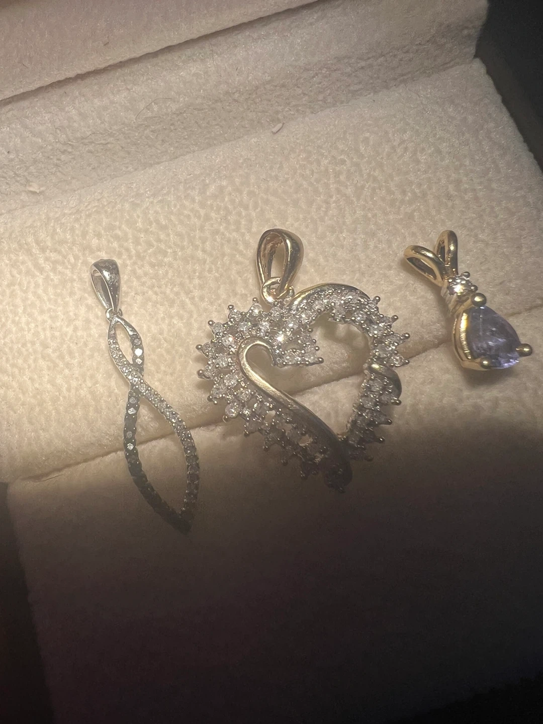 There's a 10 k heart-shaped diamond pendant -325 dollars ; 10 k black and white diamonds infinity pendant -165 dollars and a 10 k tanzanite and 1 diamond teardrop pendant -165 dollars . They look great and are ready for a new home