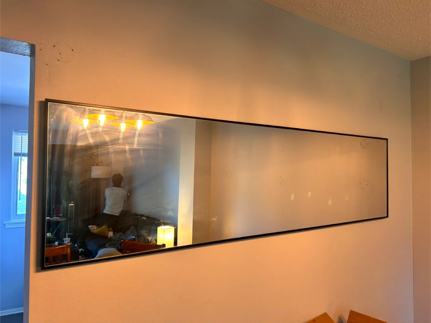 Selling a framed wall mirror. It's a sleek and simple design that would look great in any room. It's in good condition and ready to be hung up in your home