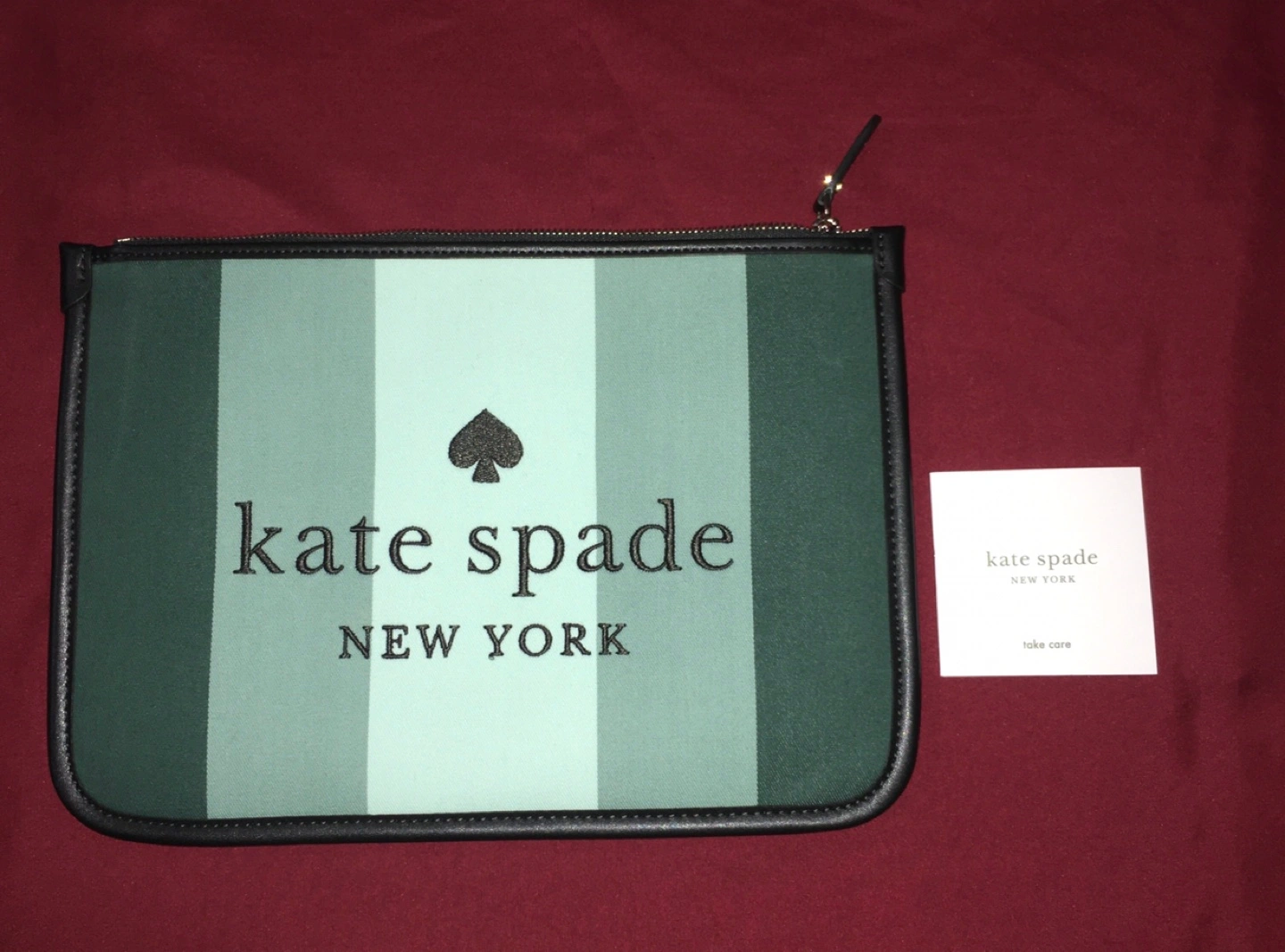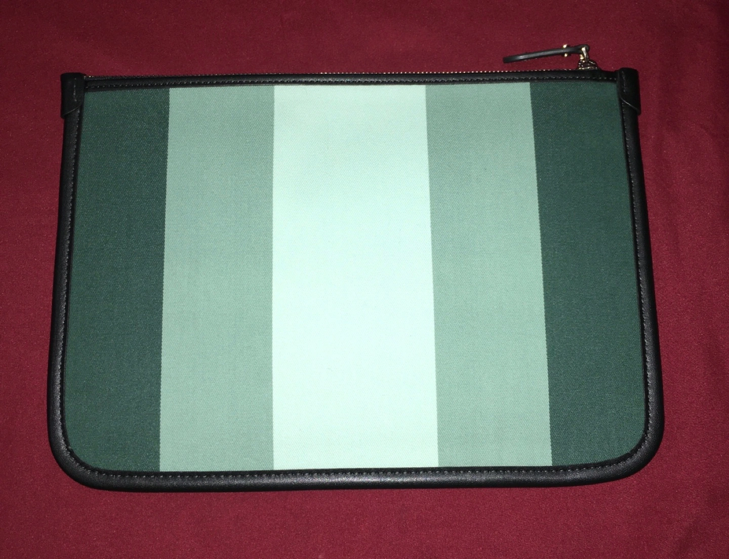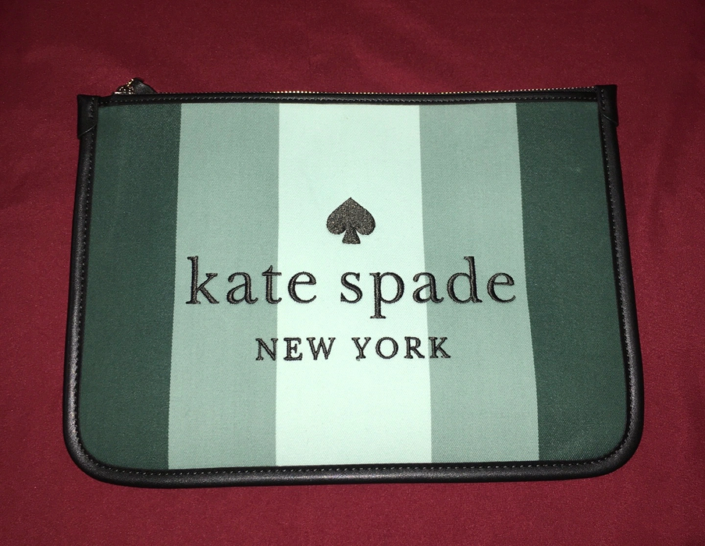 This is a Kate Spade New York pouch with a striped design in shades of green. The interior lining features a spade pattern. It's in great brand new condition . Pick up at Southgate Mall after 6pm on weekdays, weekends between 5-6pm Cash only Price reflects authenticity