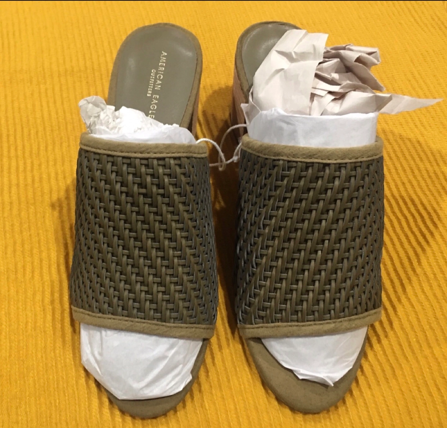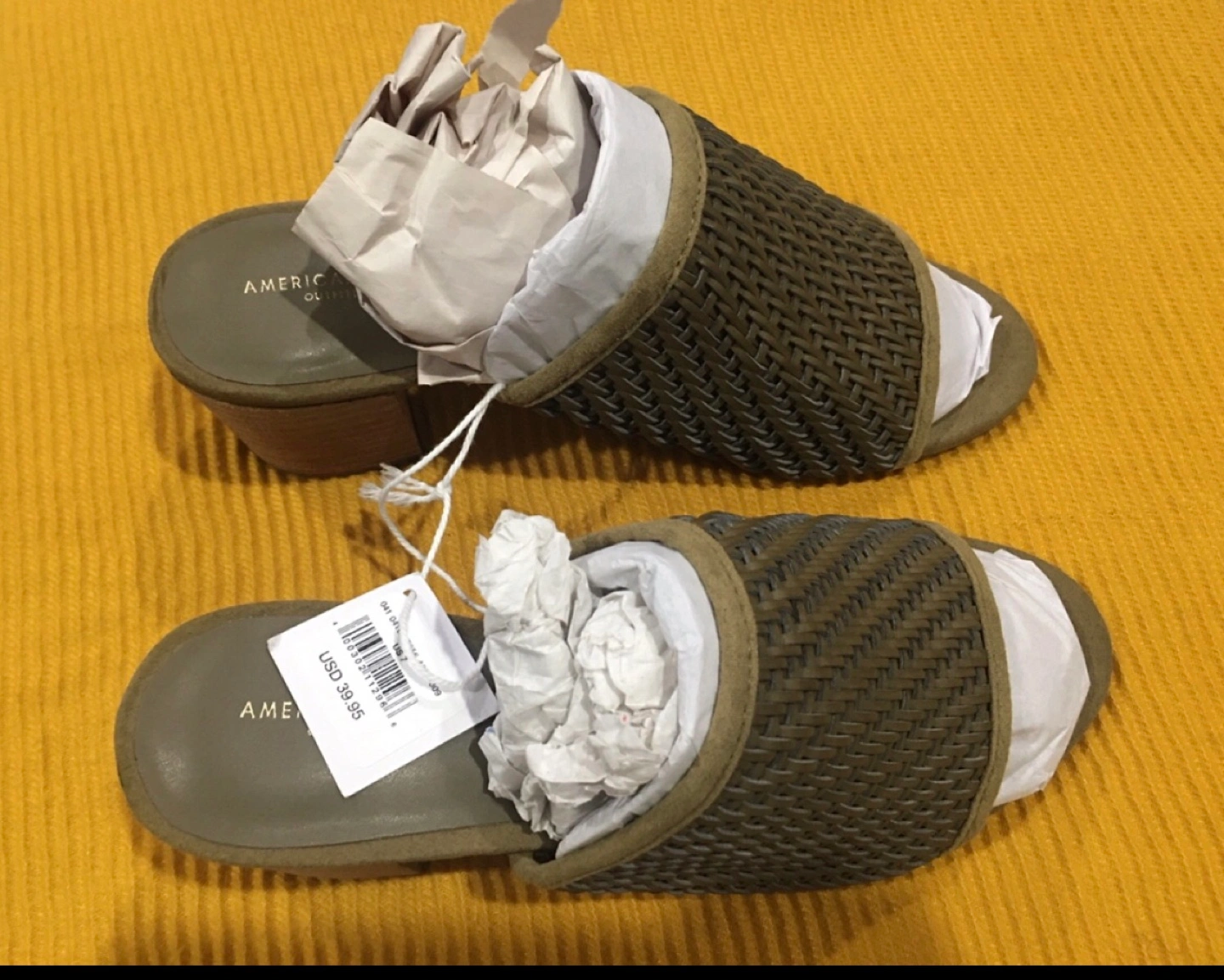 These American Eagle woven mules are in new condition! They feature a stylish woven design and a comfortable block heel. The original price tag shows USD $39.95 Size 7 Pick up at Southgate Mall after 6pm on weekdays, weekends between 5-6pm Cash only NO TRY ONS