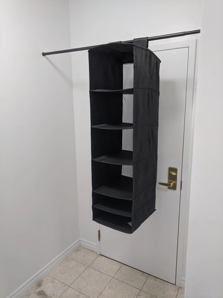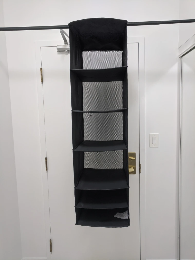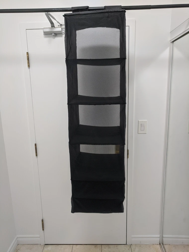 Keep your closet tidy with this black, mesh hanging closet organizer, featuring six shelves for easy storage and access. The unit hangs conveniently from your closet rod, maximizing vertical space. It is in good used condition, ready to help you get organized. * Six mesh shelves * Black colour * Hangs from closet rod * Space-saving design Size:13"(w)x17"(deep)x48"(height) Decluttering is a breeze with this handy organizer! Pick up at 195 Merton Street Toronto or pick up at the subway station Davisvill. And I can deliver it to you house but you need to pay me another $3. Thanks.