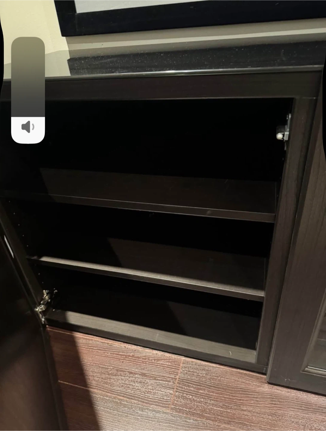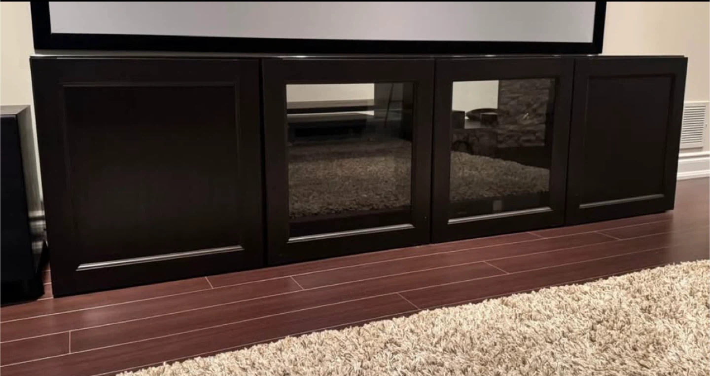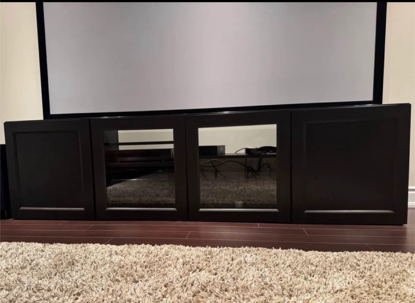 Set of two matching entertainment/media units in dark wood finish with a sleek removable dark glass top. • Can be used together as one long wall unit or placed separately • Combination of solid panel doors and glass doors for concealed + visible storage • Adjustable shelving for AV equipment, gaming consoles, or accessories • modern, clean design • Dark glass top adds a premium look and protects the surface • good condition Dimensions (approx.): Each unit is- 47 1/2 “ wide x 16 1/2 deep x 26 Price is for a set 1/2 the price if buying one unit PICKUP ONLY Cash