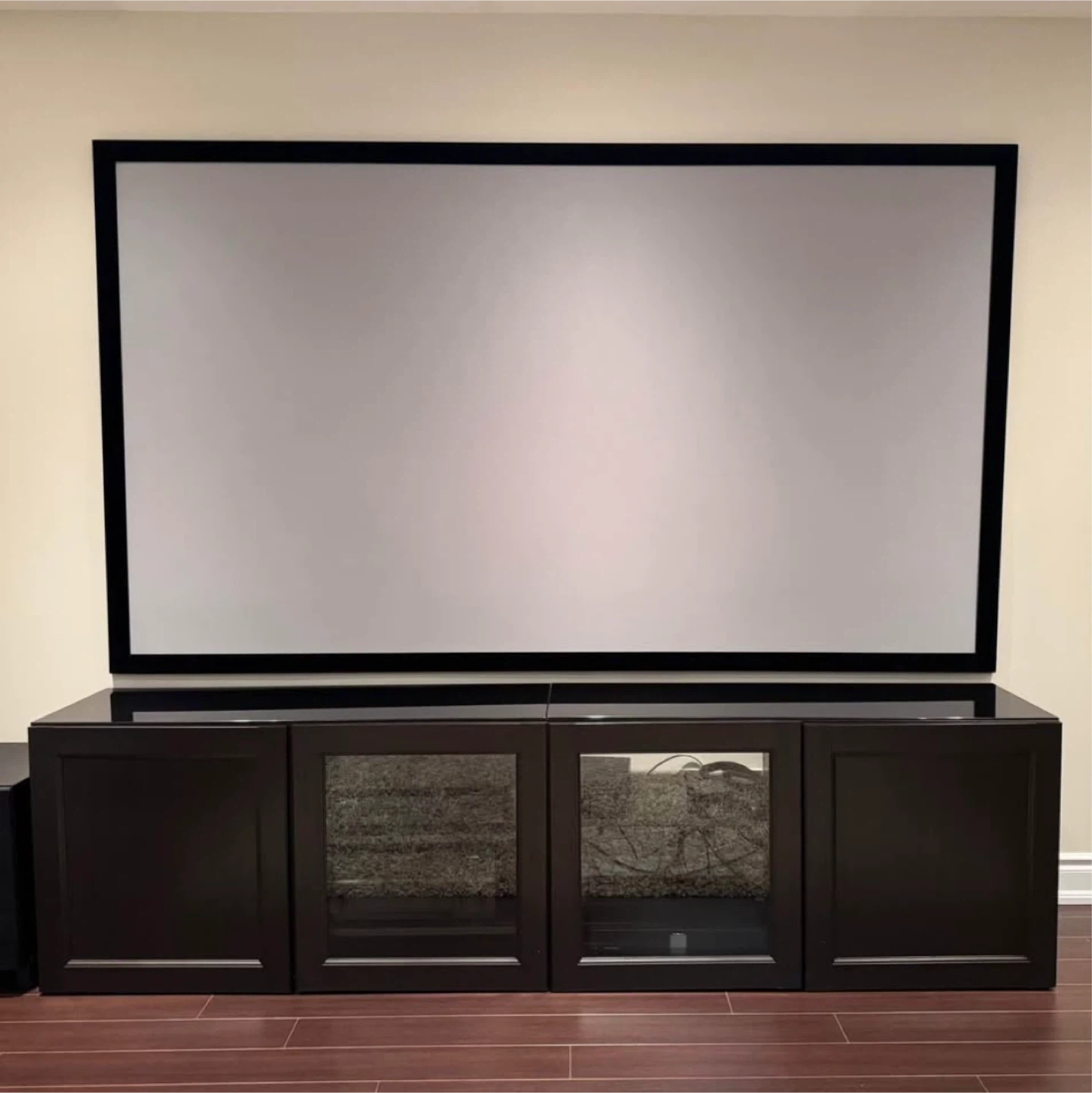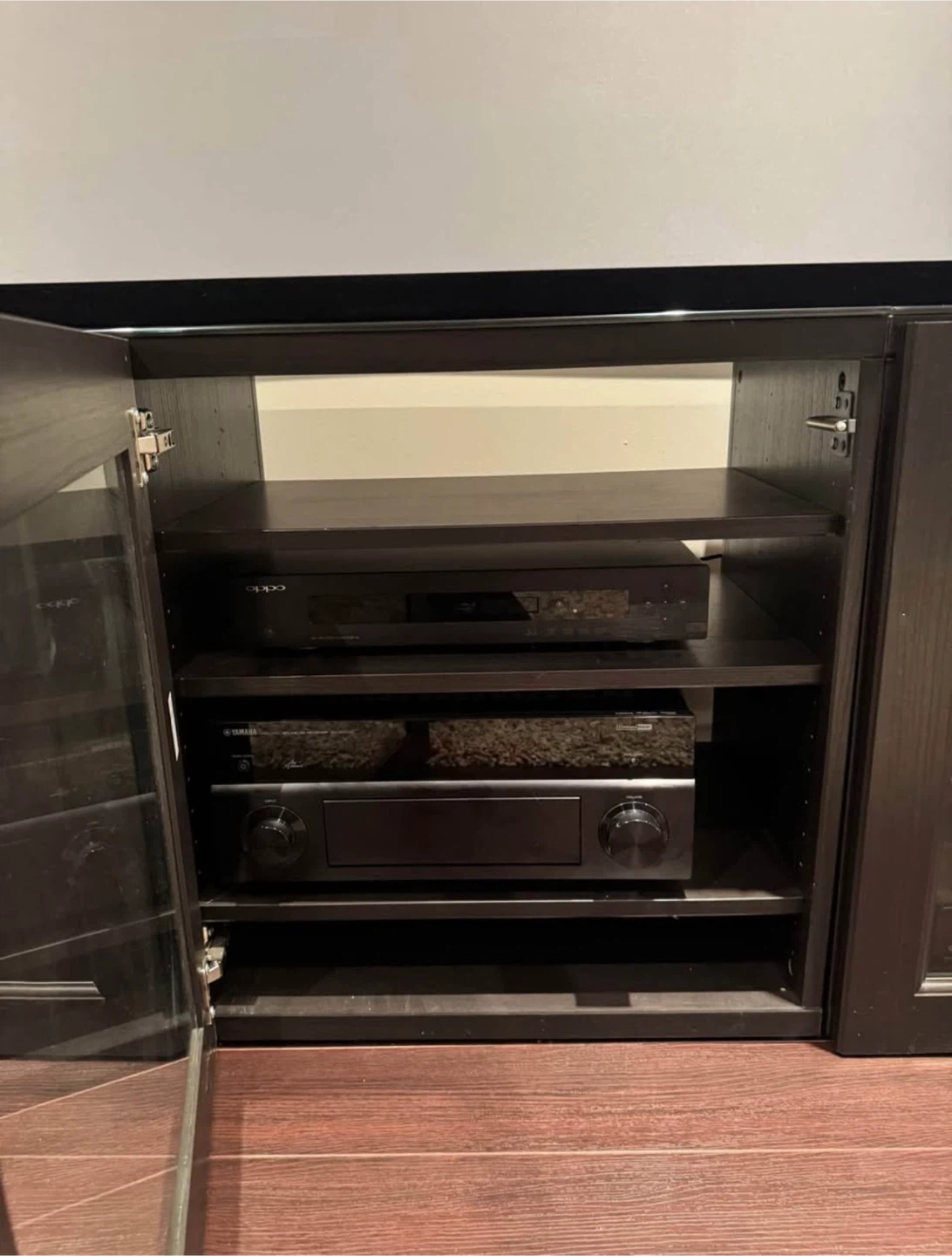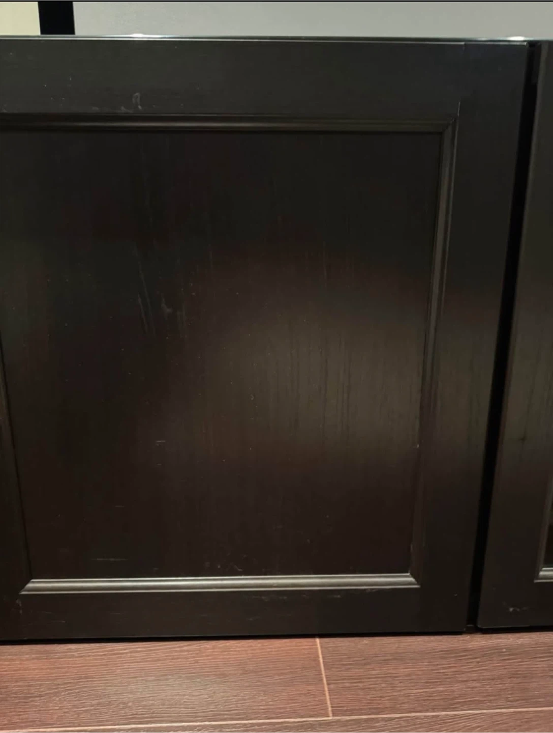 Set of two matching entertainment/media units in dark wood finish with a sleek removable dark glass top. • Can be used together as one long wall unit or placed separately • Combination of solid panel doors and glass doors for concealed + visible storage • Adjustable shelving for AV equipment, gaming consoles, or accessories • modern, clean design • Dark glass top adds a premium look and protects the surface • good condition Dimensions (approx.): Each unit is- 47 1/2 “ wide x 16 1/2 deep x 26 Price is for a set 1/2 the price if buying one unit PICKUP ONLY Cash