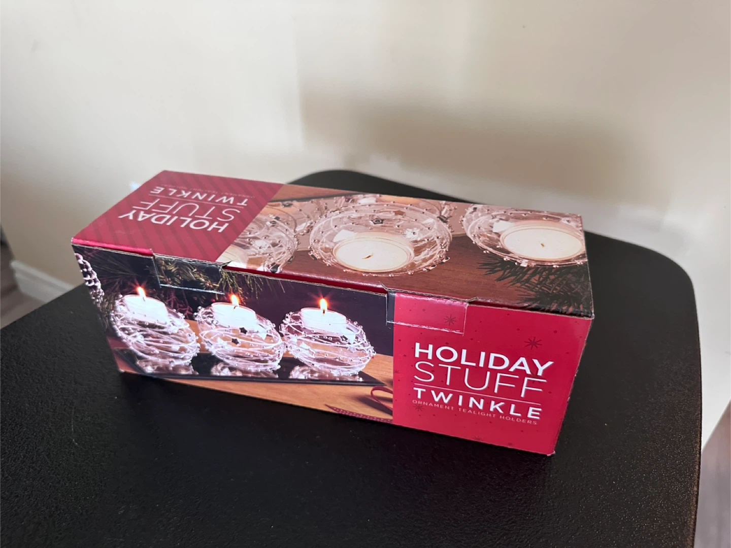 Add a touch of sparkle to your home with these Holiday Stuff Twinkle Ornament Tealight Holders! These holders are brand new and come in their original box. They're perfect for creating a cozy and festive atmosphere during the holidays or any time of year! The box says they measure 27 cm x 8 cm x 8 cm tall, or 10.75" x 3.25" x 3.25".