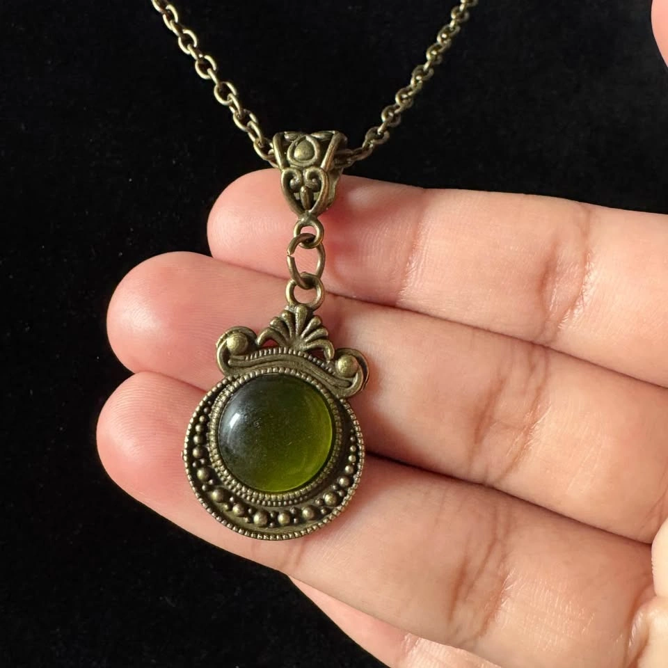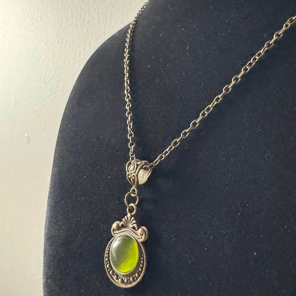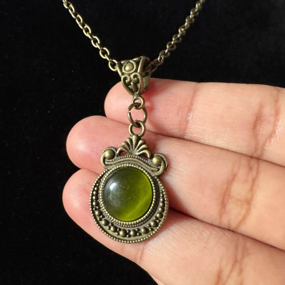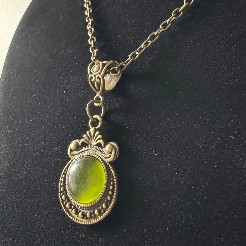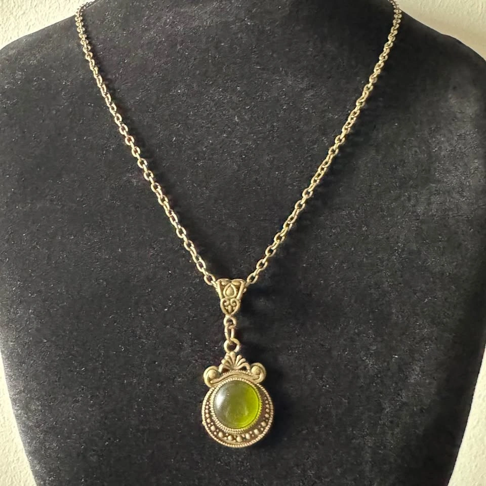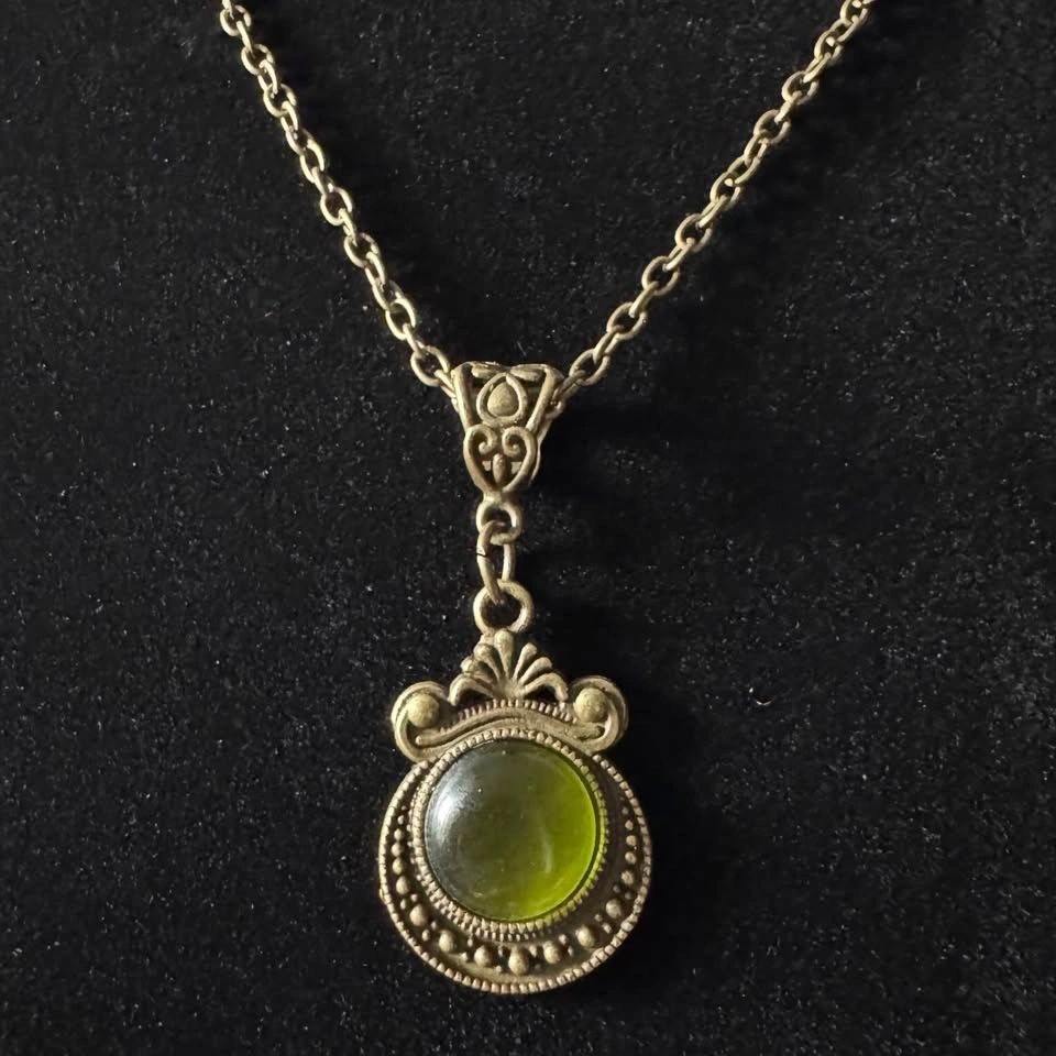 This bronze tone chain with a gorgeous, unique Victorian renaissance pendant with olive green cabochon is a simple yet elegant piece of jewelry that will enhance any outfit. This will also make a beautiful gift for a loved one's birthday. Please see photos and let me know if you require further information. Chain length: 20” (approx) This item is new, unused