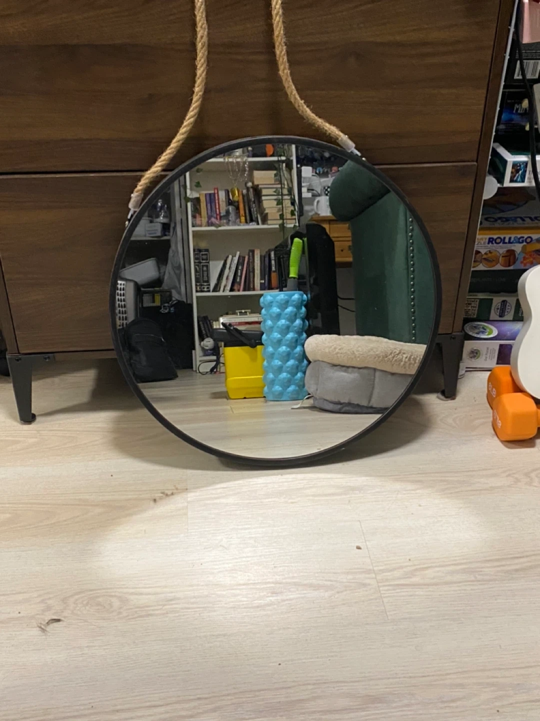 Selling a round mirror with a rope for hanging. It's in great shape and measures about 19 inches in diameter. Perfect for adding a rustic touch to any room!