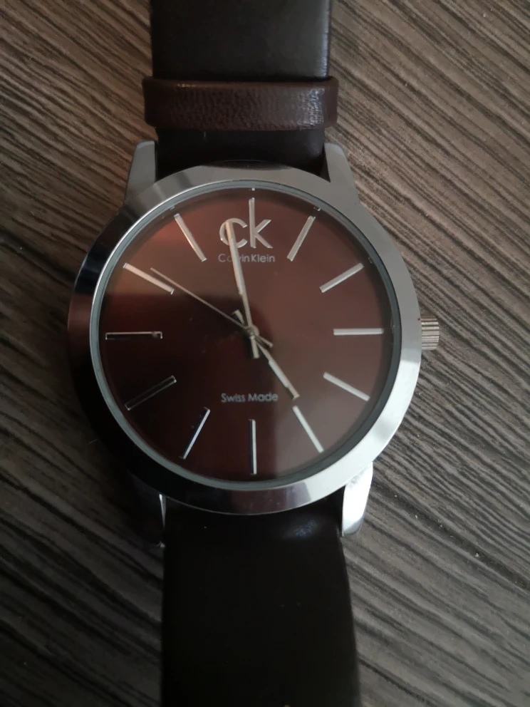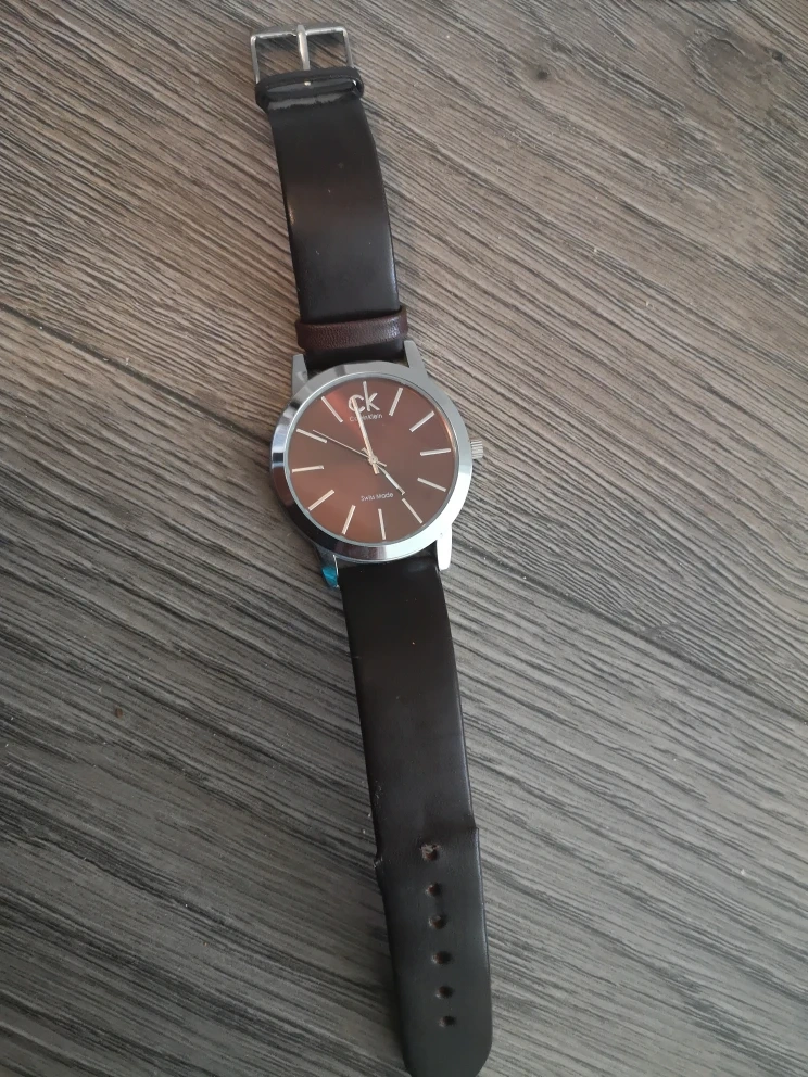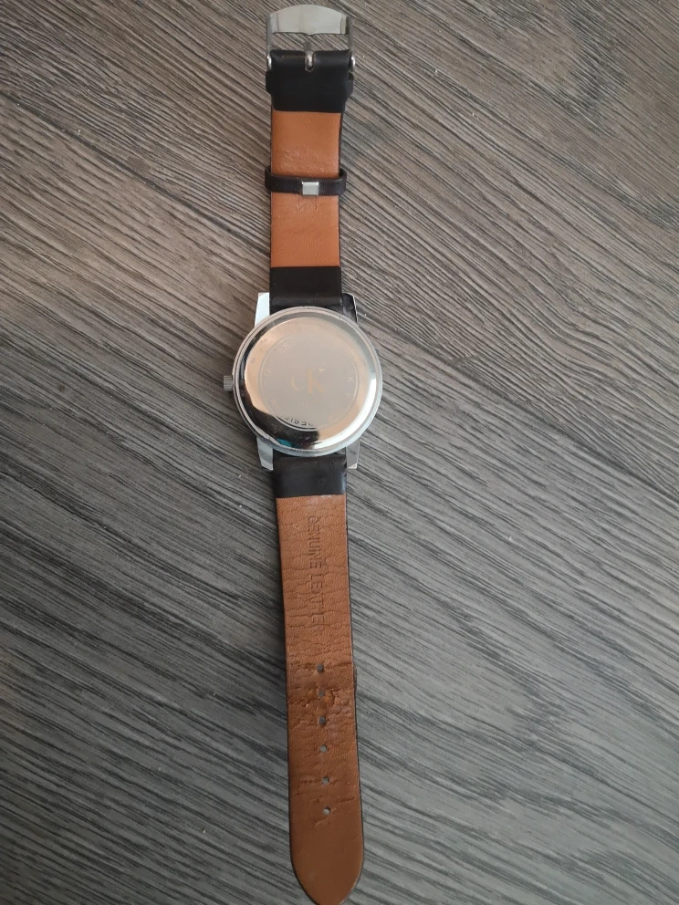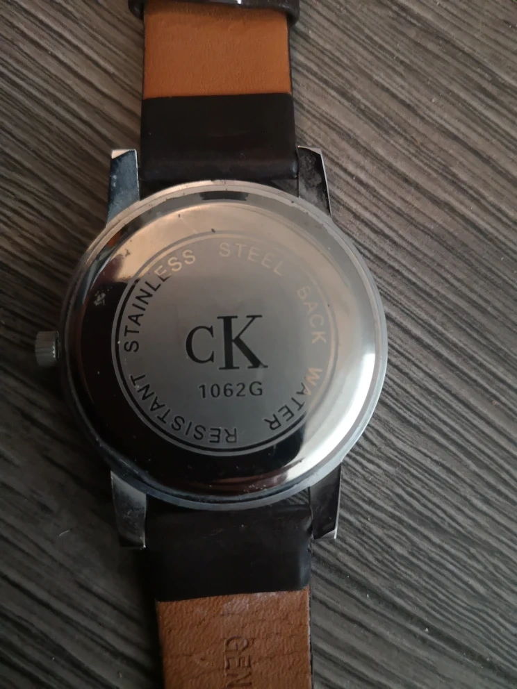 Selling a Calvin Klein (CK) watch with a brown face and leather strap. The model number is 1062G. The back of the watch says 'Stainless Steel Back' and 'Water Resistant'.