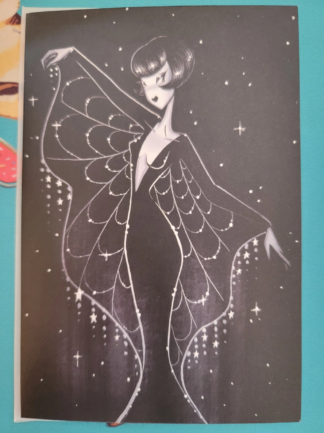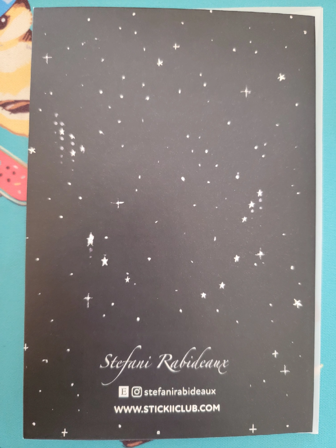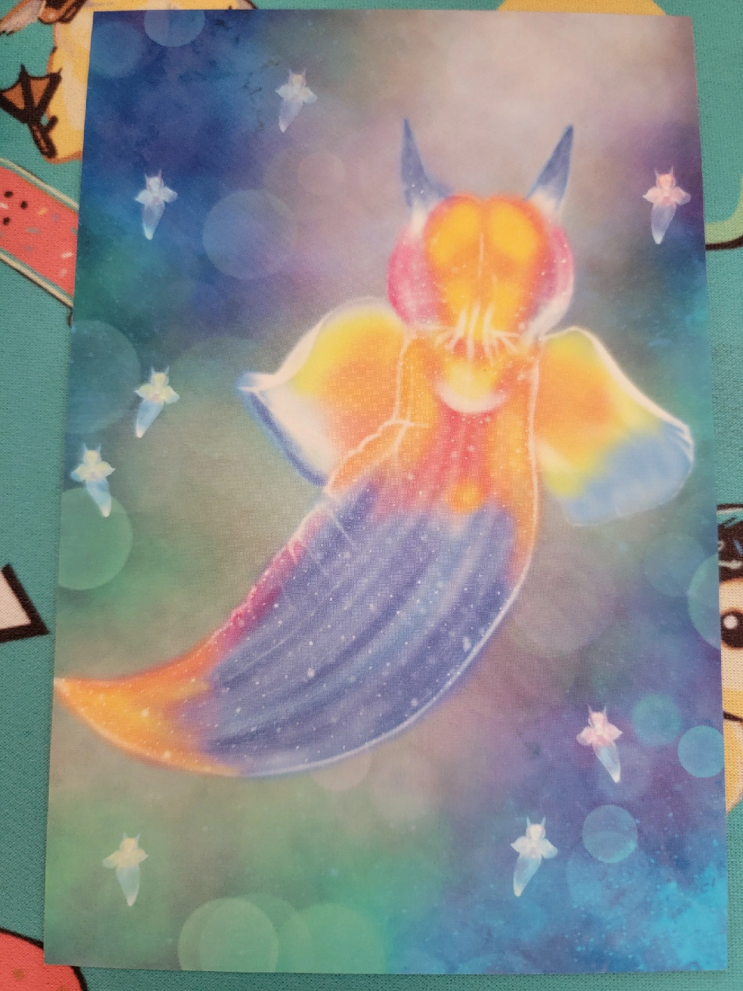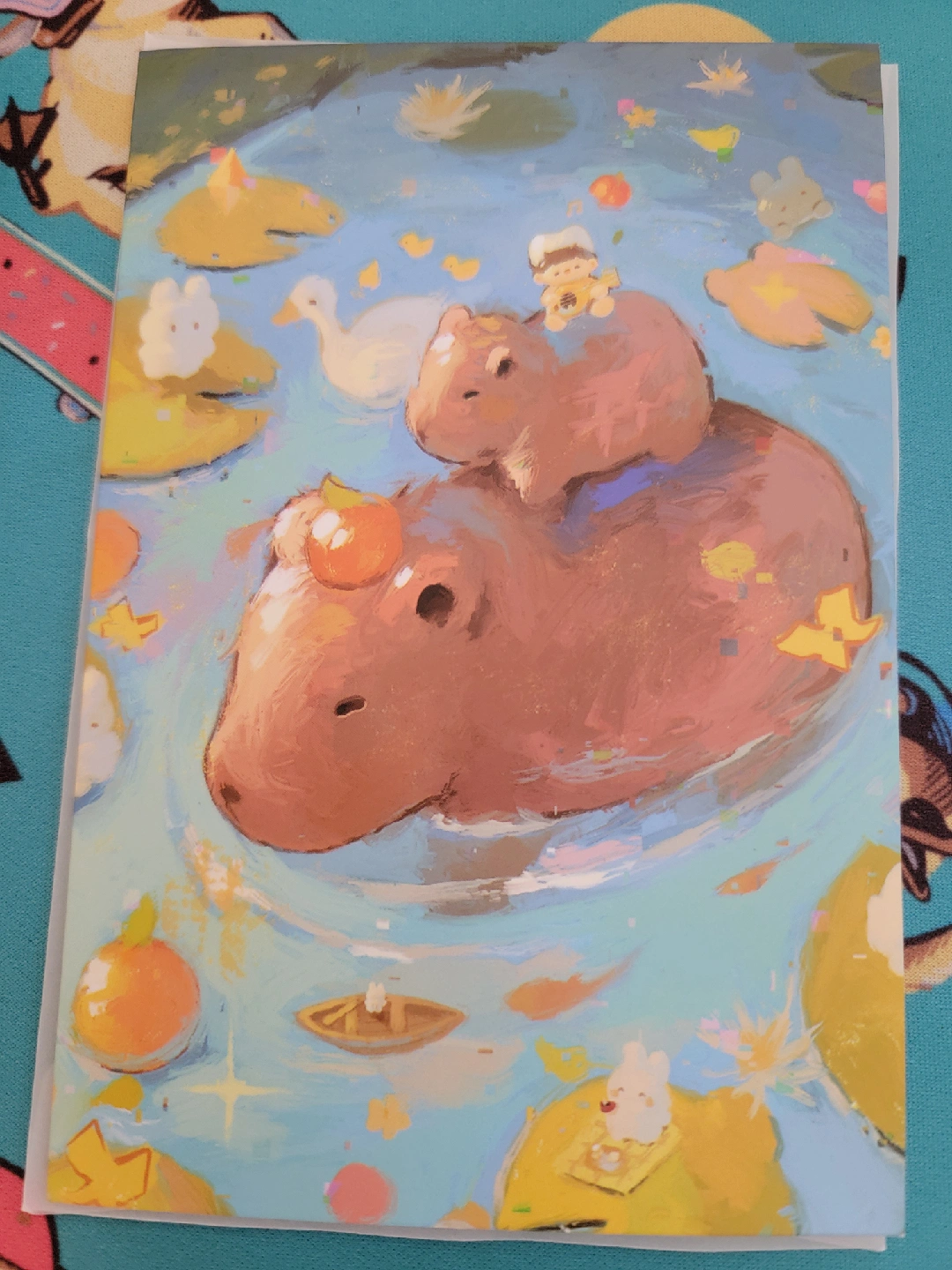 Selling a set of art cards. They are in excellent condition and come in a protective plastic. The set includes a sea angel, a capybara design, and a goth feminine figure design, all with unique and charming artwork!
