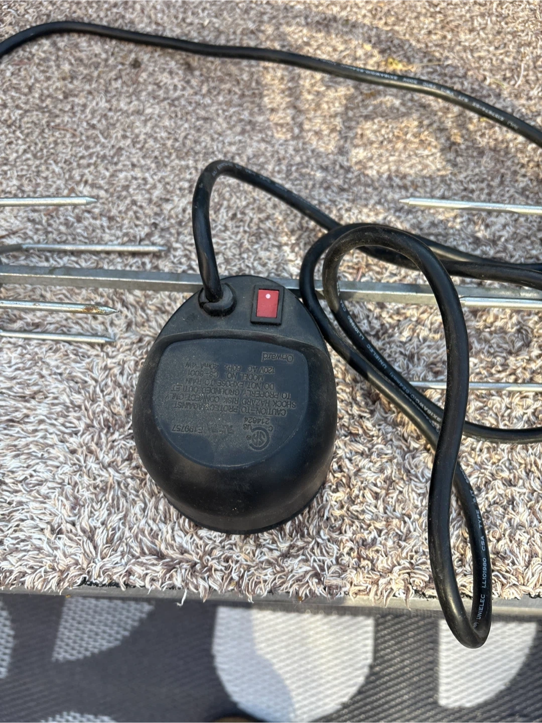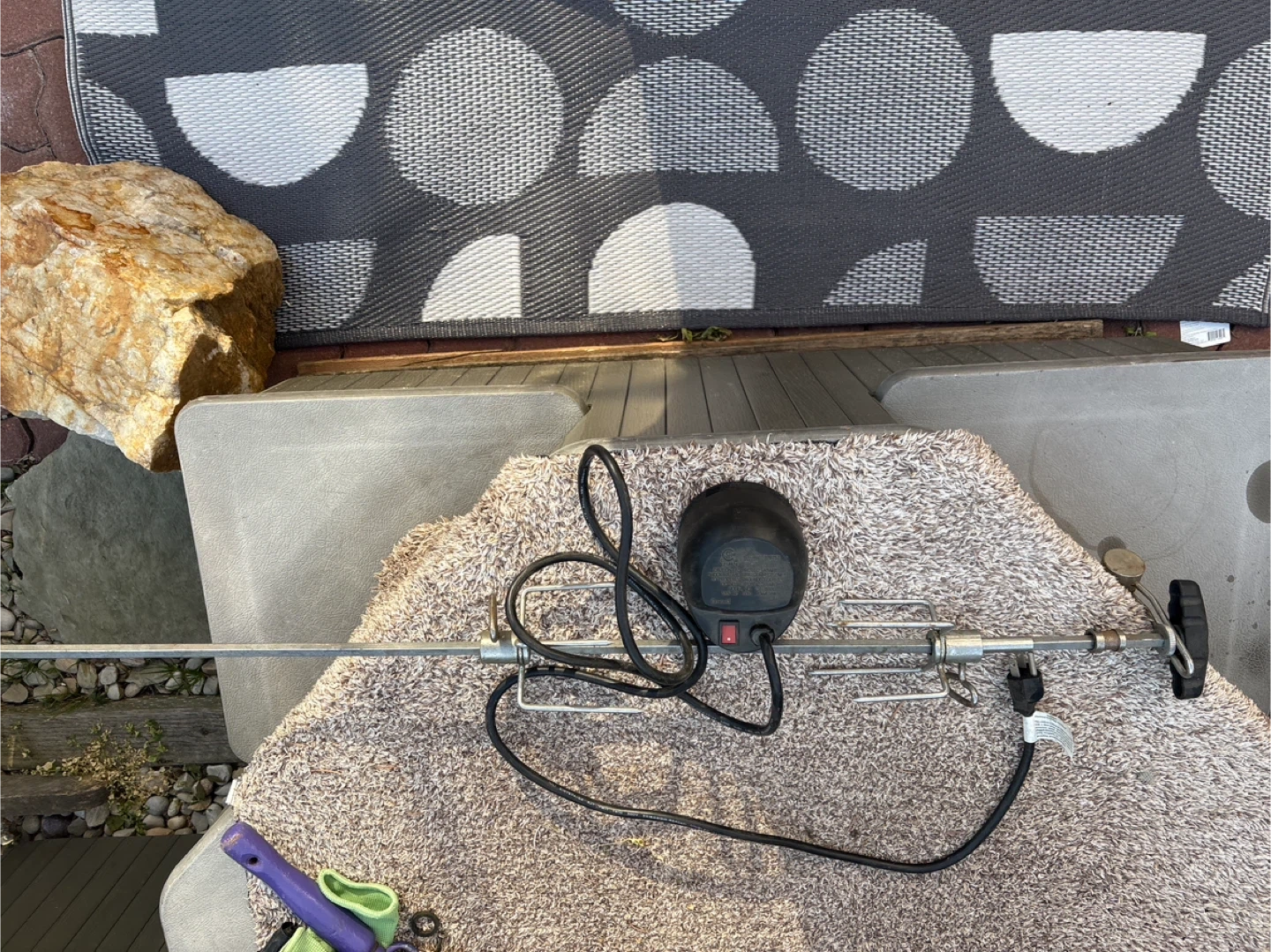 Selling a rotisserie grill. It's in good condition and ready to use for your next barbecue! Perfect for grilling chicken, roasts, and more. It has a black motor housing and a metal skewer.