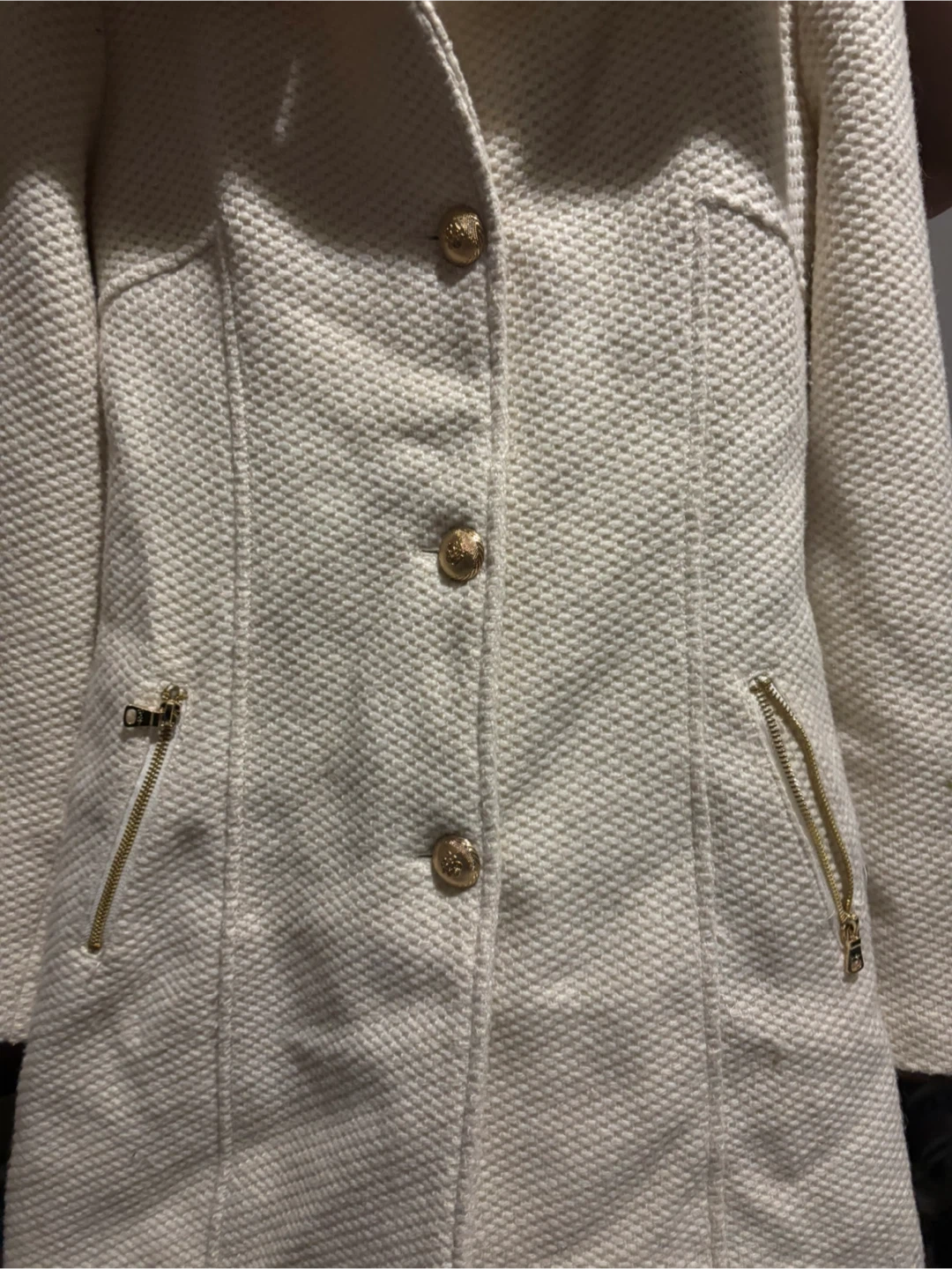 Selling a cream-coloured textured jacket. It has gold-toned buttons and zipper details. Great for spring or fall!