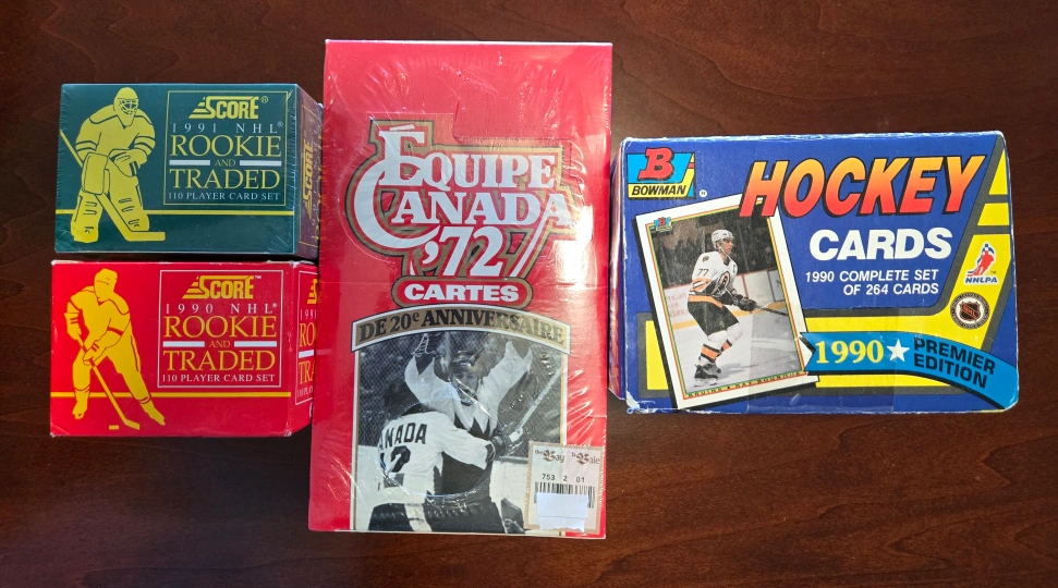 Selling a collection of vintage NHL hockey card sets! Included are: - 1990 Bowman Hockey Cards Complete Set of 264 Cards Premier Edition - 1990 Score NHL Rookie and Traded 110 Player Card Set - 1991 Score NHL Rookie and Traded 110 Player Card Set - Team Canada 72 -20th. Anniversary Wax Box.