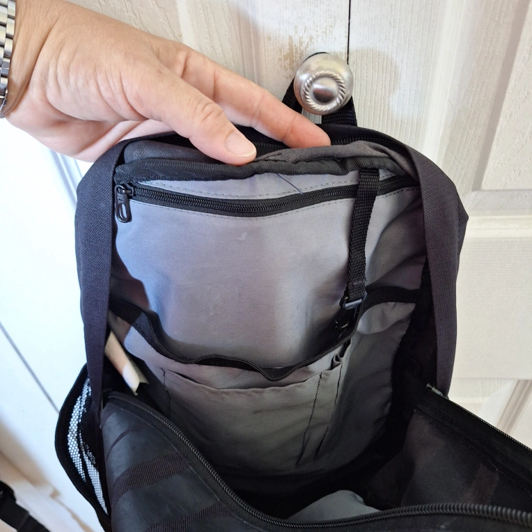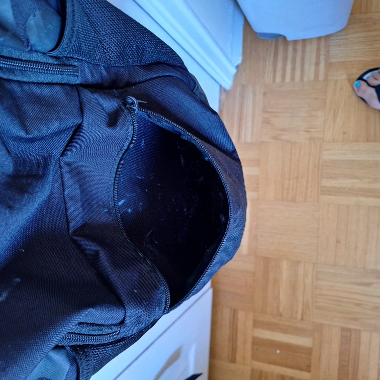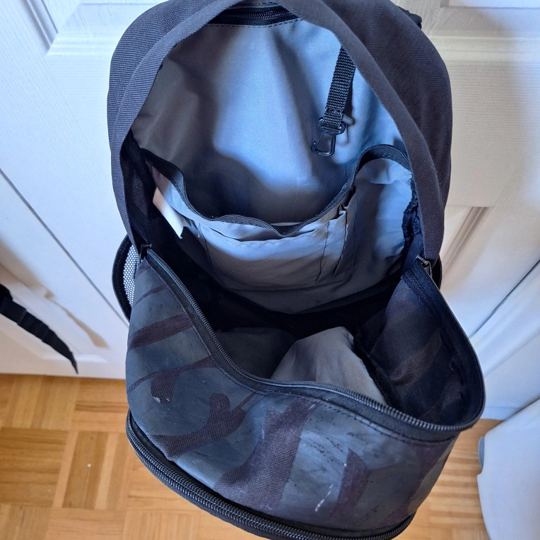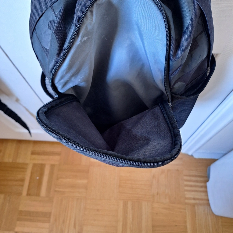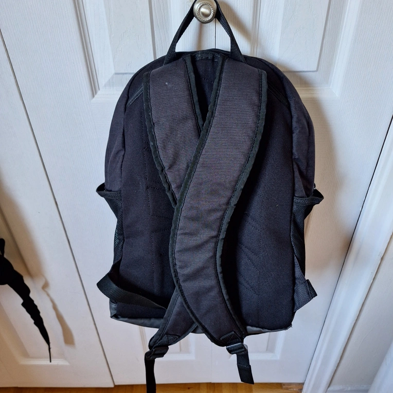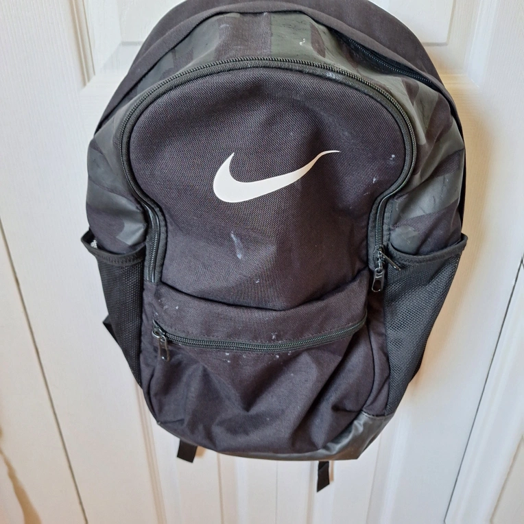 Selling a black Nike backpack. It has a white Nike swoosh logo on the front, two zippered compartments, and two mesh side pockets. The interior is light grey with a few small pockets. It's in good used condition and ready for a new home! Some stains but still doesn't affect usage. Zippers work great.