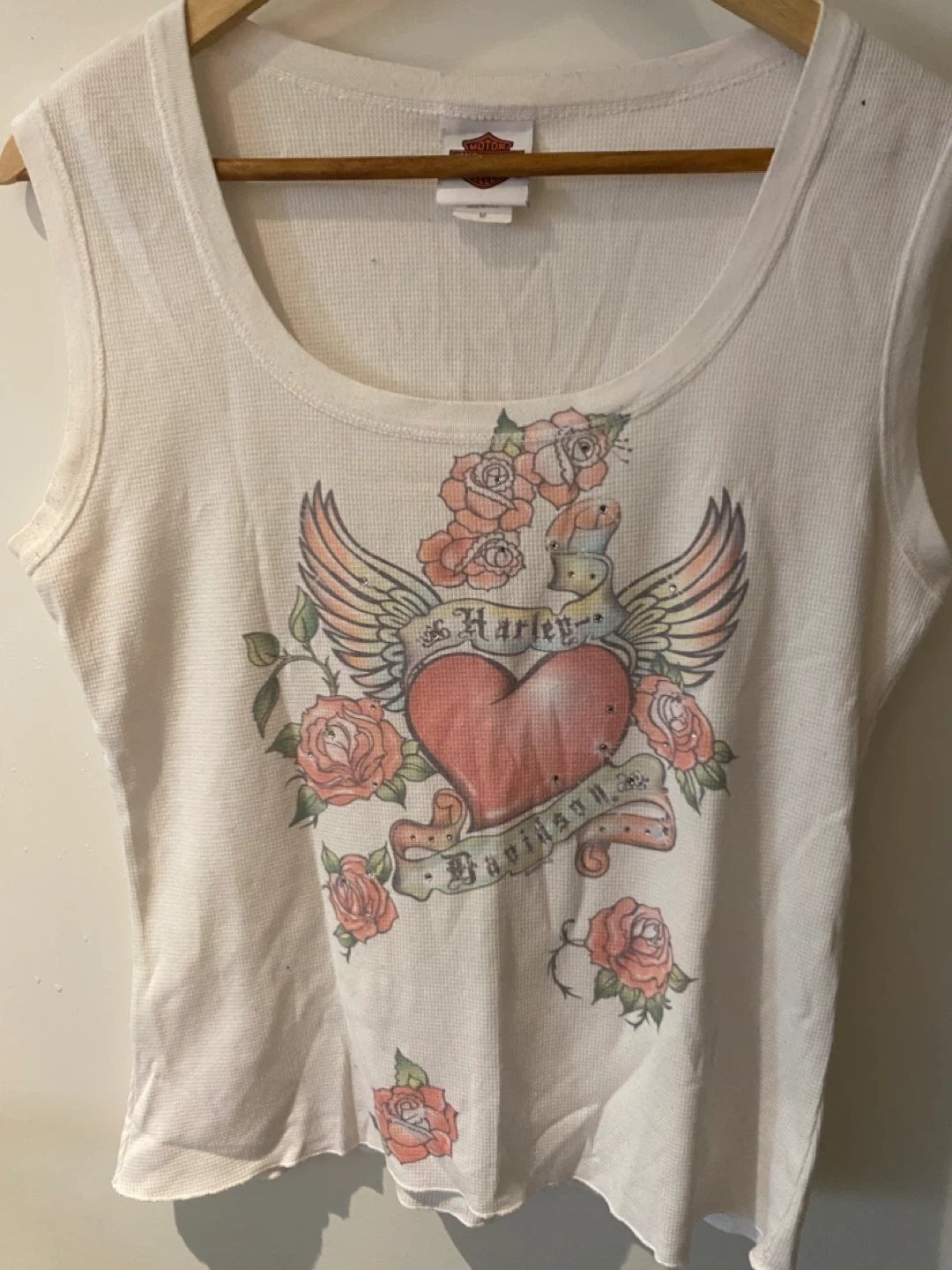 Harley Davidson Trev Deeley Motorcycles tank top from Vancouver, BC. It has a heart and rose design with rhinestones. Great for any Harley enthusiast! ( Vintage no stains)