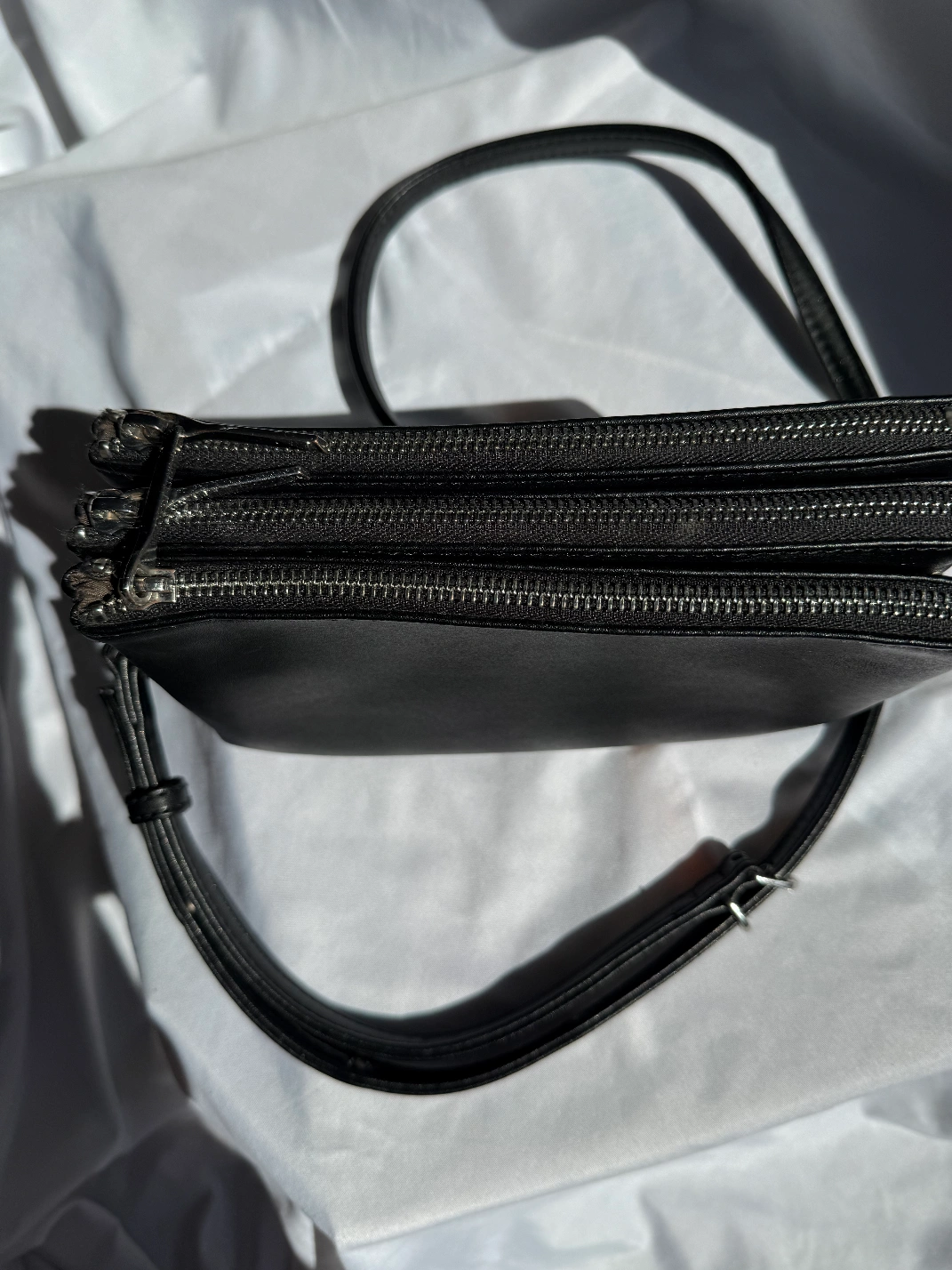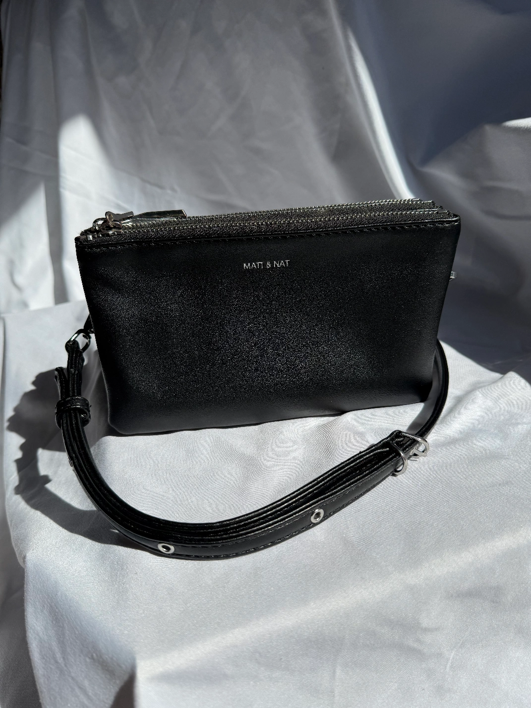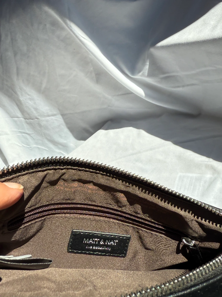 Selling a gently used Matt & Nat crossbody bag. It's in like new condition and perfect for everyday use! The bag is made of vegan leather and features a sleek black design. It has multiple zippered compartments to keep your belongings organized