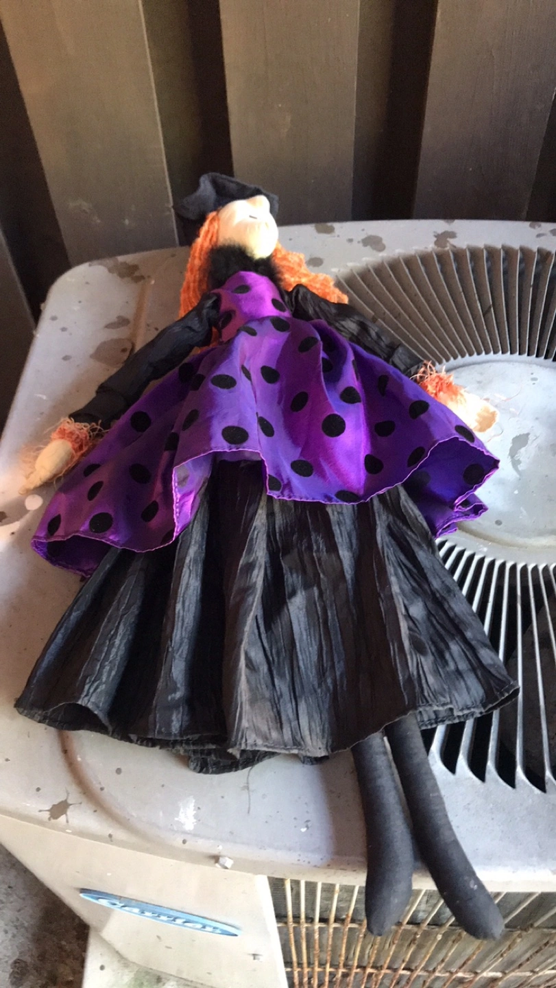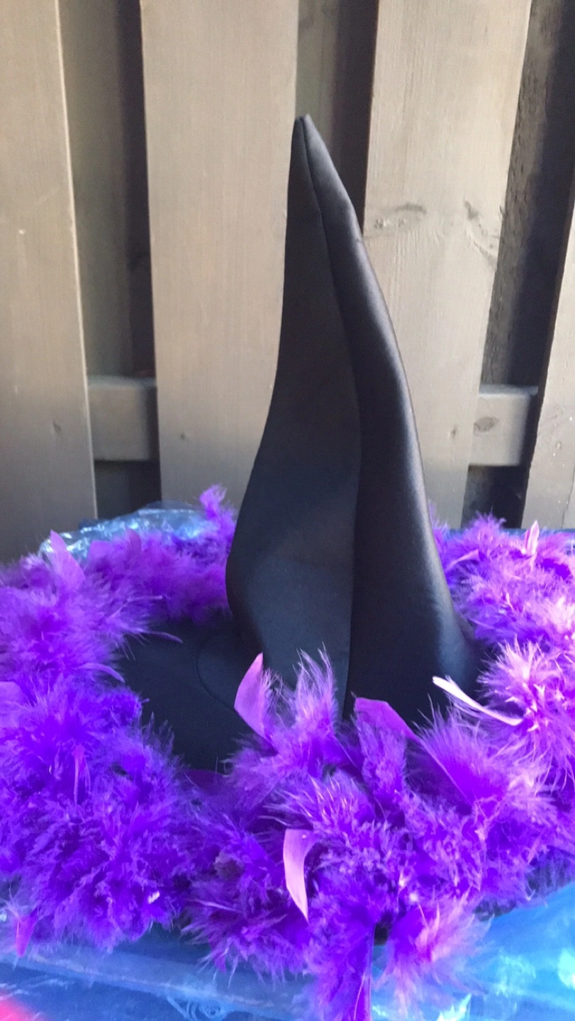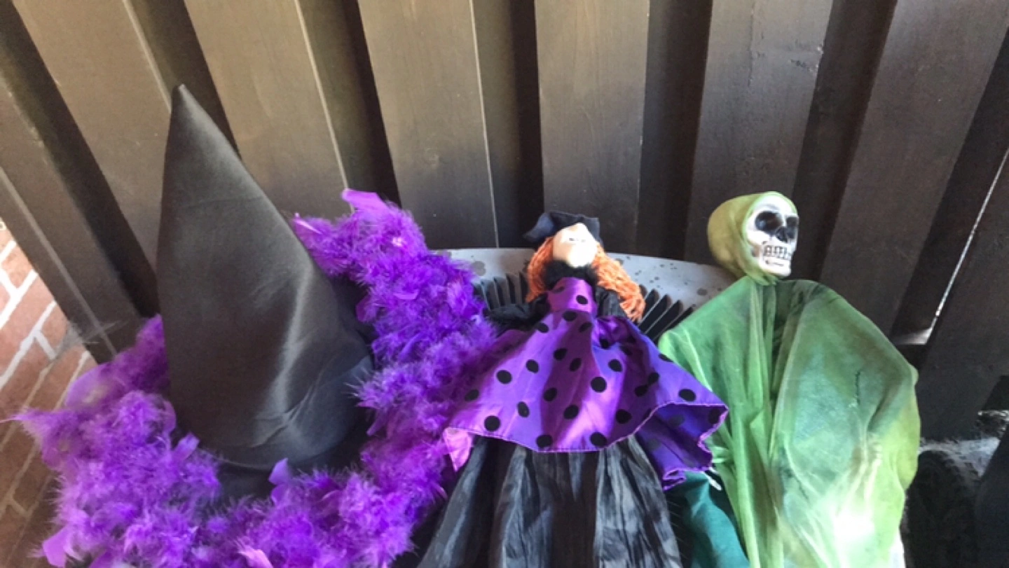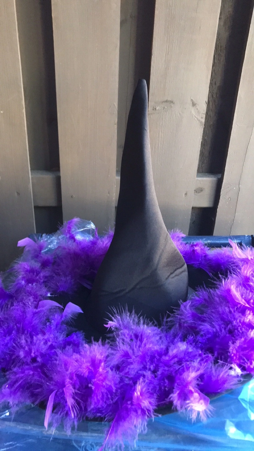 Cute Halloween witch decoration, perfect for adding a spooky touch to your home this season! A black adult witches hat with purple boa around the rim. A purple witch that can hang from a nail or a hook . A green skeleton face with a green hood and gown which can also be used as a hanging Halloween decor. Pick up location is 10 Alcorn Avenue M4V1E4