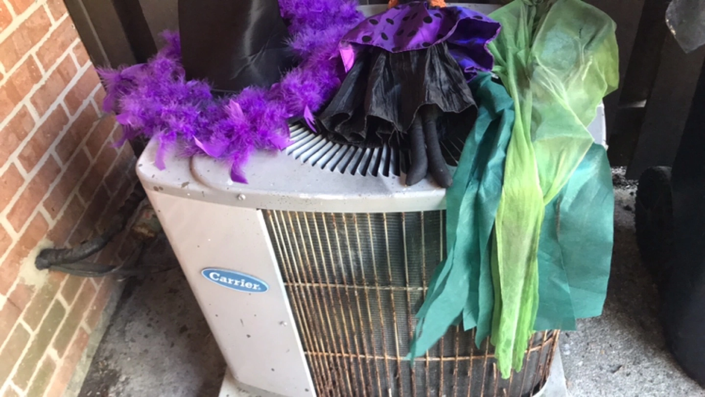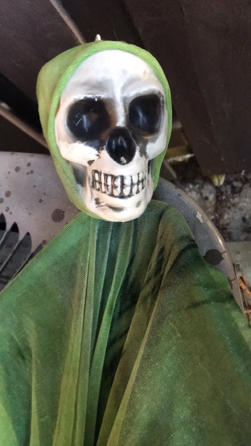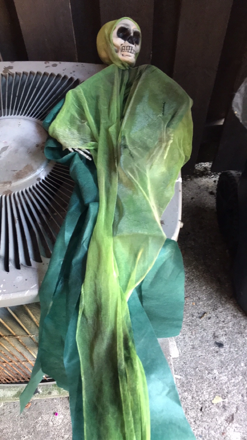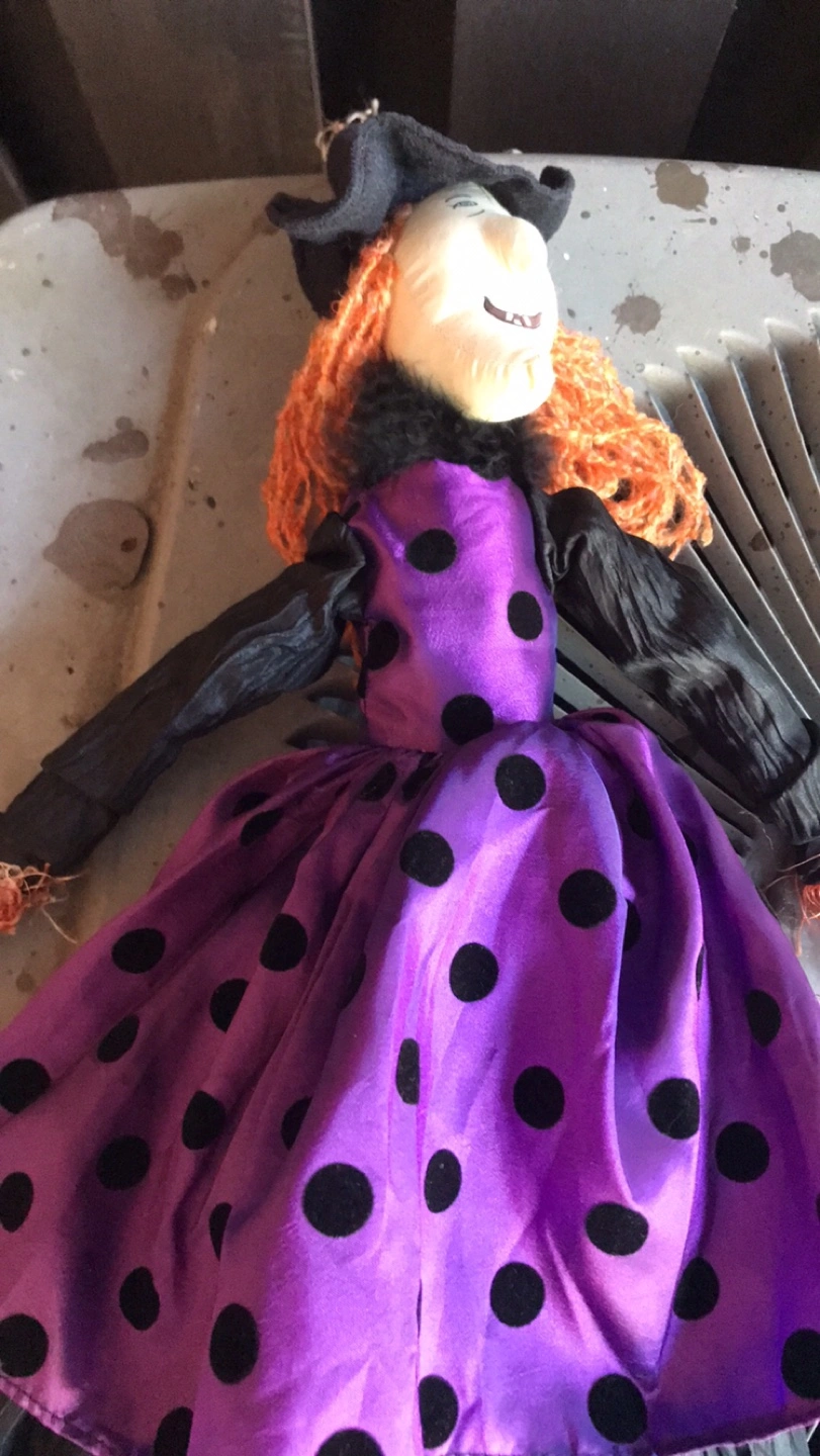 Cute Halloween witch decoration, perfect for adding a spooky touch to your home this season! A black adult witches hat with purple boa around the rim. A purple witch that can hang from a nail or a hook . A green skeleton face with a green hood and gown which can also be used as a hanging Halloween decor. Pick up location is 10 Alcorn Avenue M4V1E4