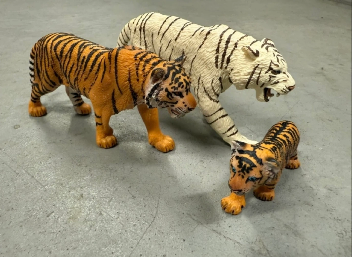 Selling a set of Schleich tiger figurines. Includes an orange tiger, a white tiger, and a tiger cub. Great for collectors or kids who love animals