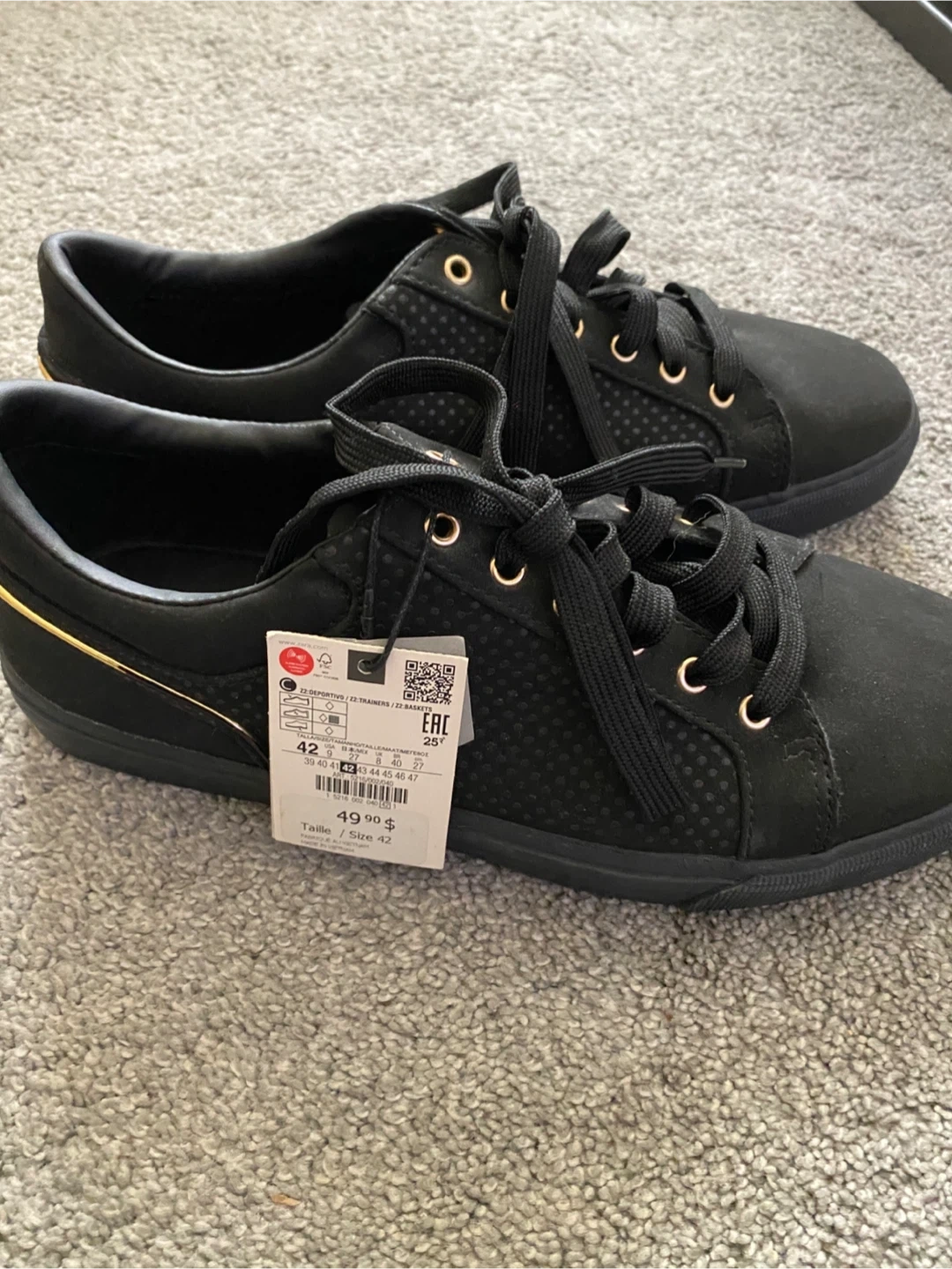 BRAND NEW pair of Zara black sneakers in size 42 (US 9). They feature a stylish design with gold accents