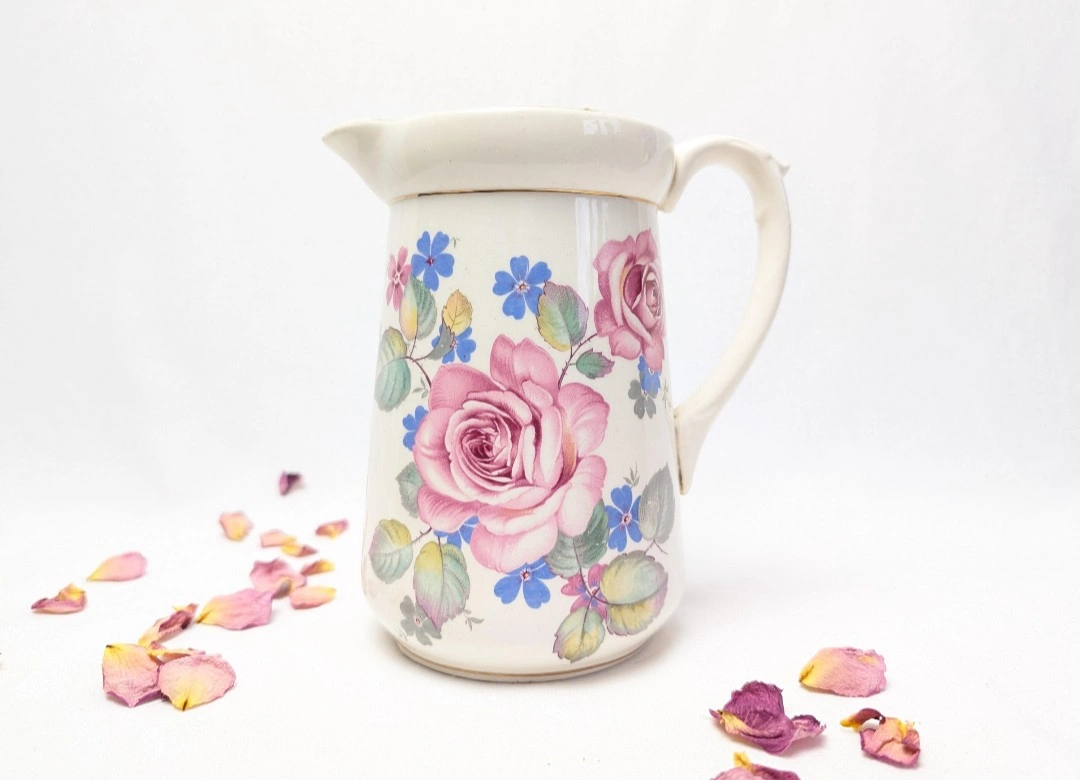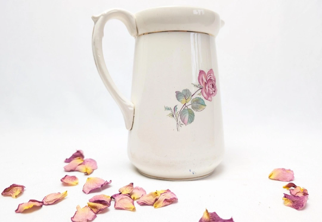 Vintage porcelain pitcher ~ vase. Measures 6.5 inches in height and 3.75 inches in diameter. Holds approximately 32 fluid ounces. Stunning hand painted rose motif. Made in England. Good vintage condition, consistent with age. Some minor wear to the gold gilding on the handle and rim. Excellent vintage charm. 👇 PICK UP TOWNLINE HWY 2 AREA 👈 CASH is preferred please ☺️ Thanks for looking 🩵