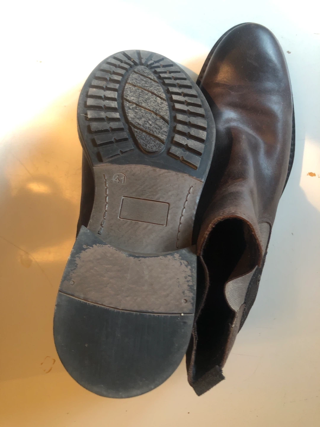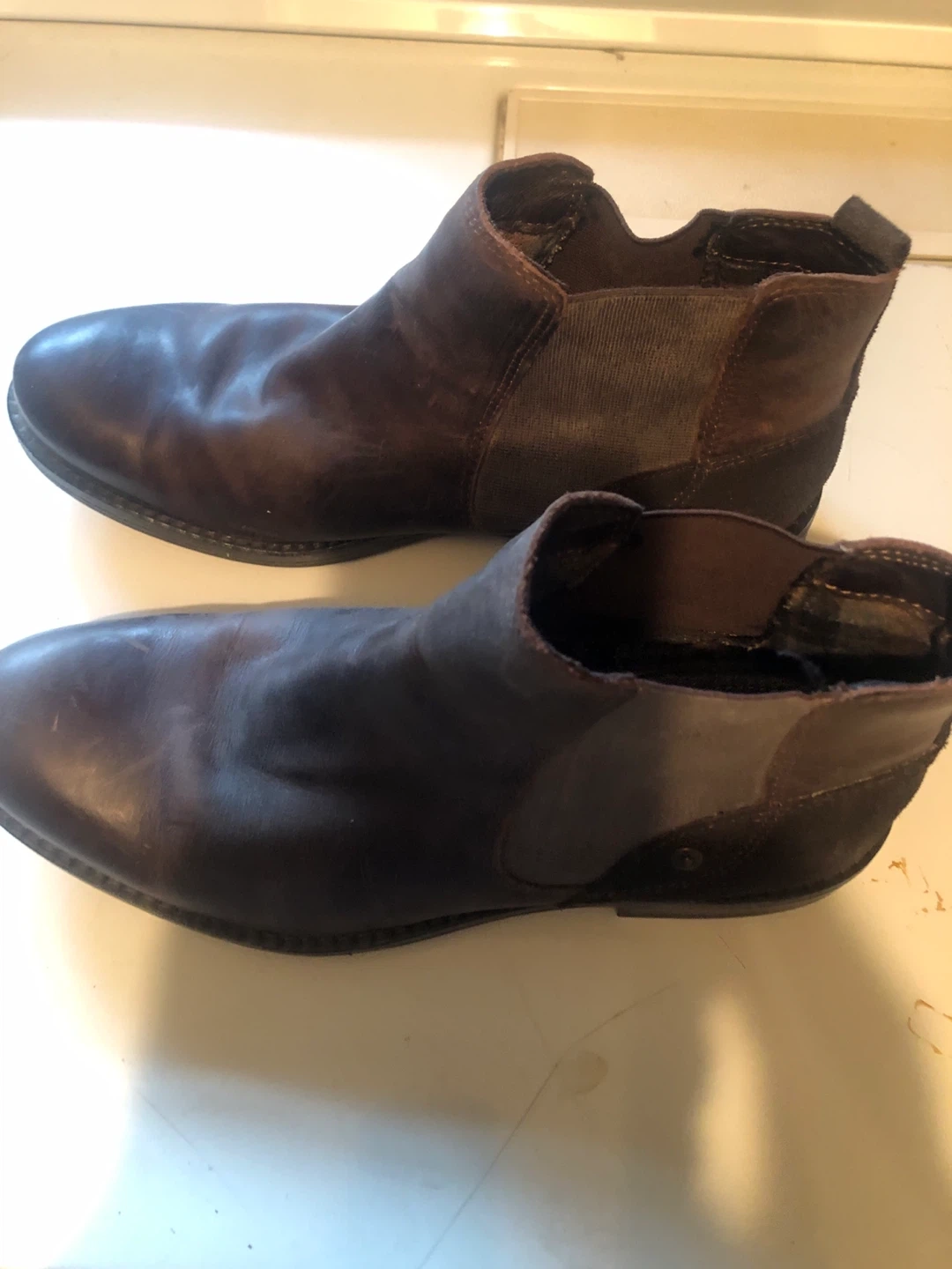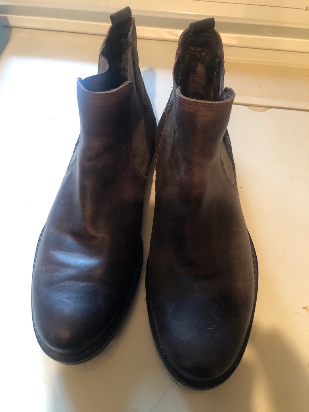 Selling a pair of Born Chelsea boots in a dark brown leather. They are a size 7. The soles have some wear, but the leather is in good condition!