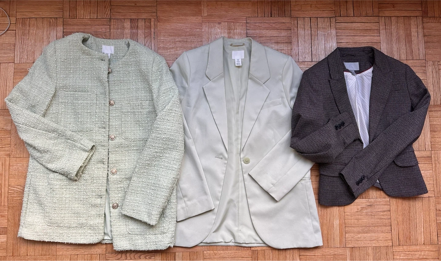 CLOTHING CLEAROUT Selling a bundle of three H&M blazers in size XS. Excellent conditions One is a light green tweed style, another is a solid light beige, and the third is a brown and grey patterned blazer. All are in great condition and ready for a new home! Selling all together Pick up near Yonge and Bloor