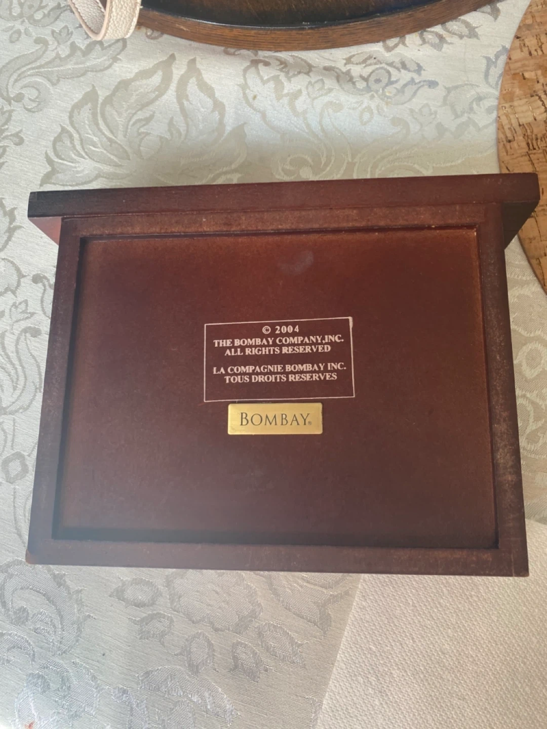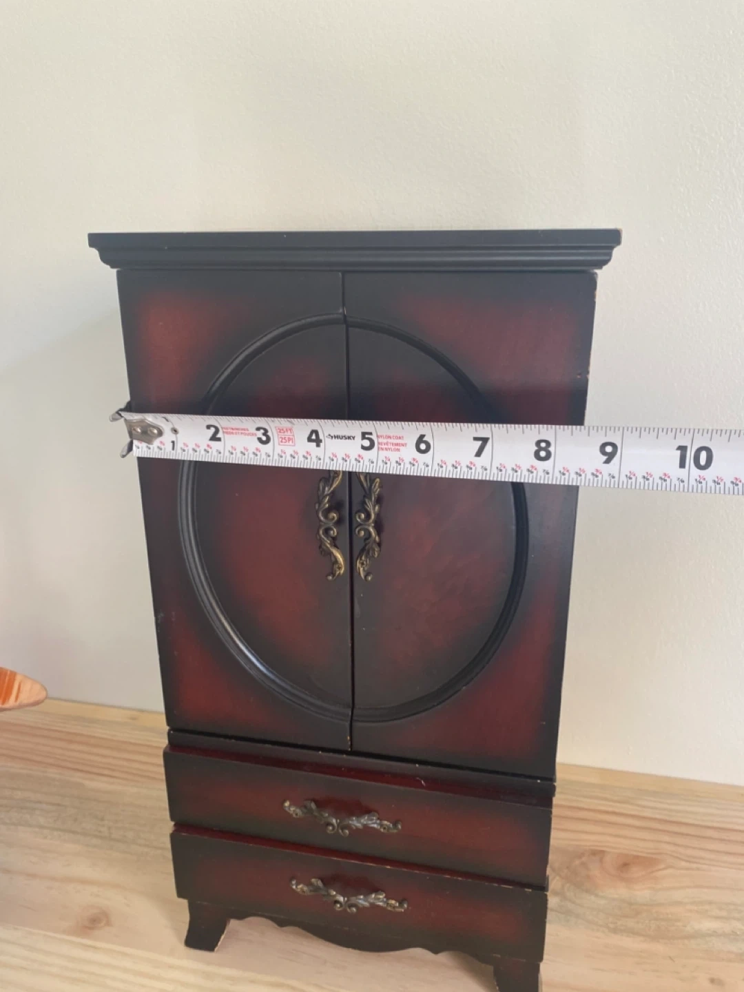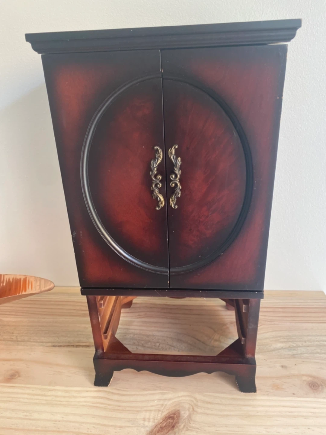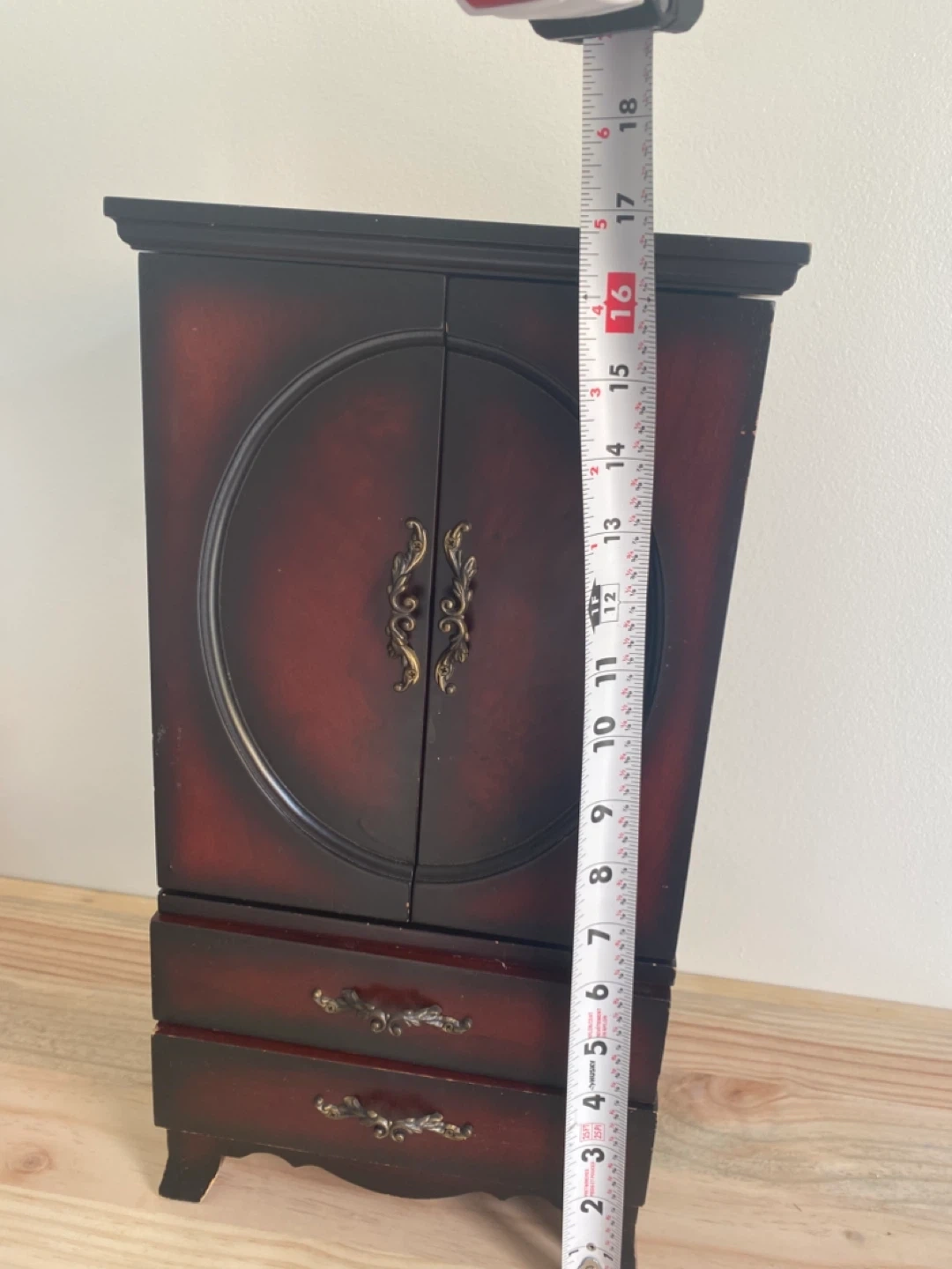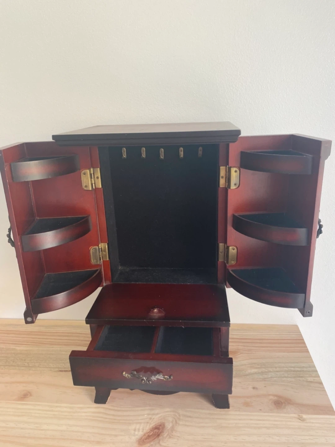 Bombay jewellery box in good condition. It's a lovely piece for storing your precious items, with a mirror and lots of compartments! It measures approximately 17 inches in height