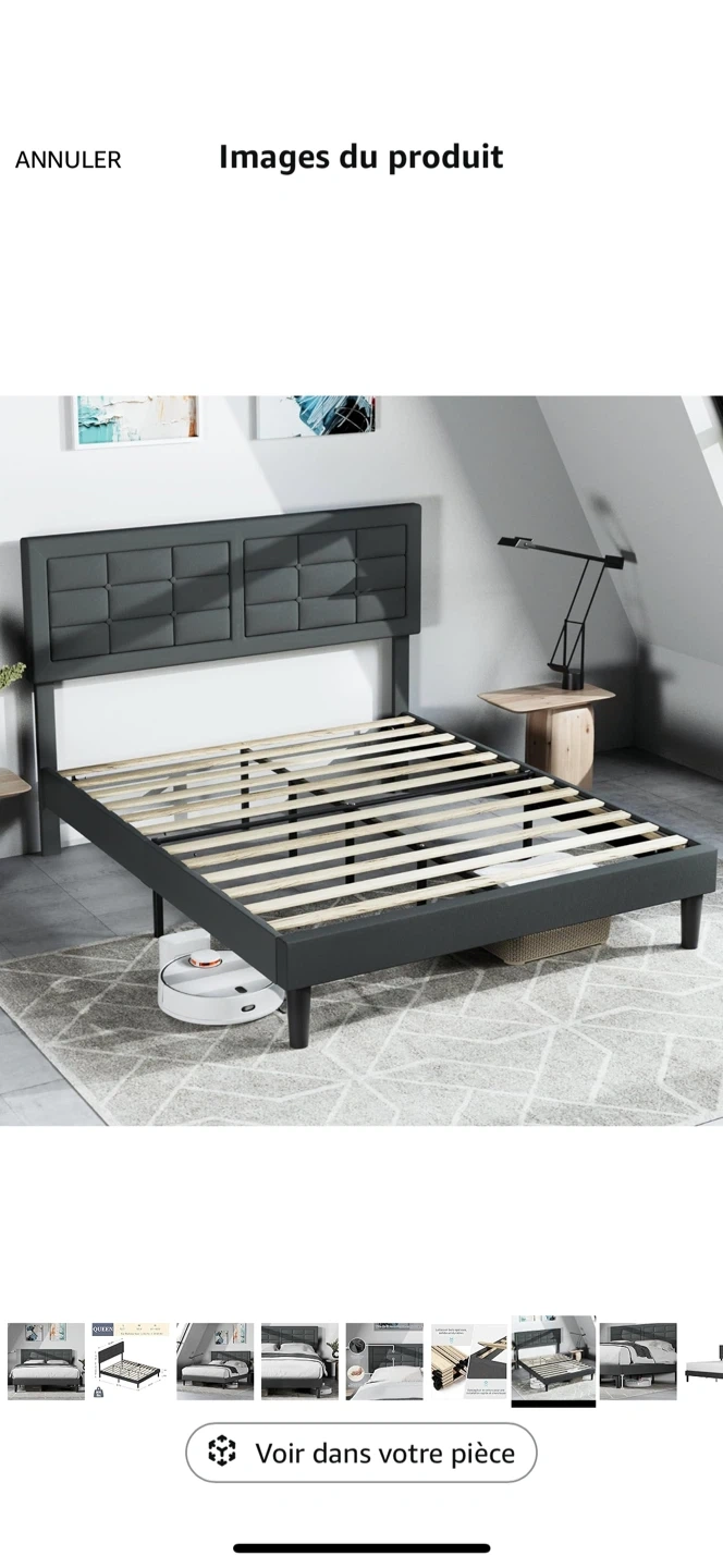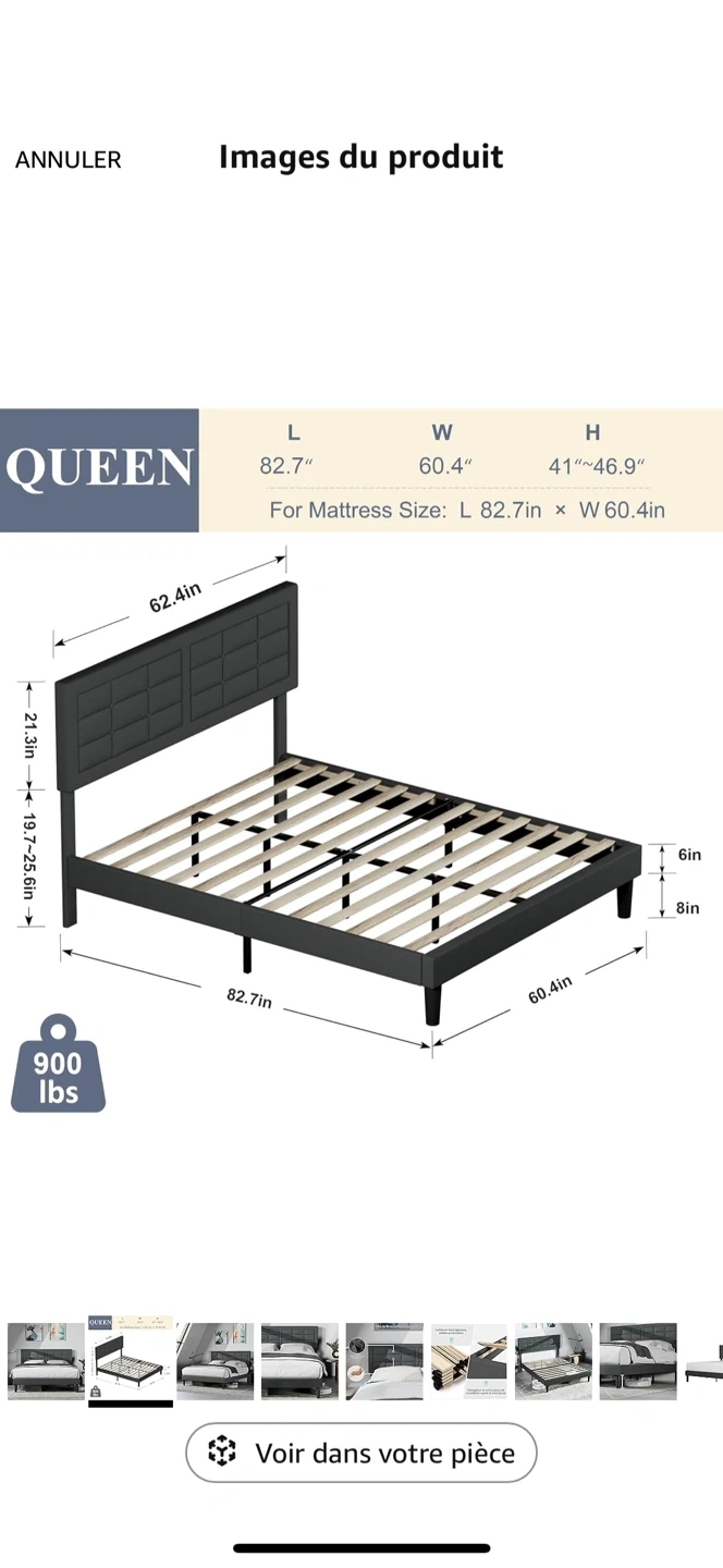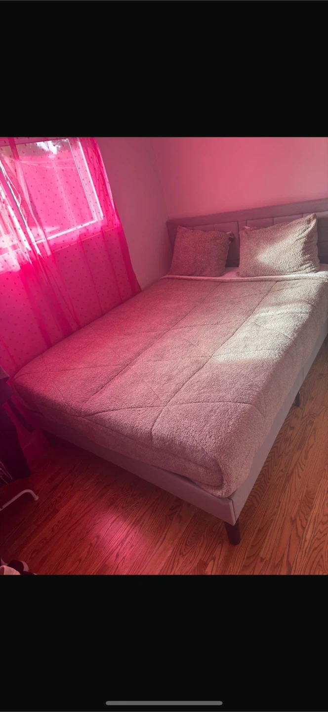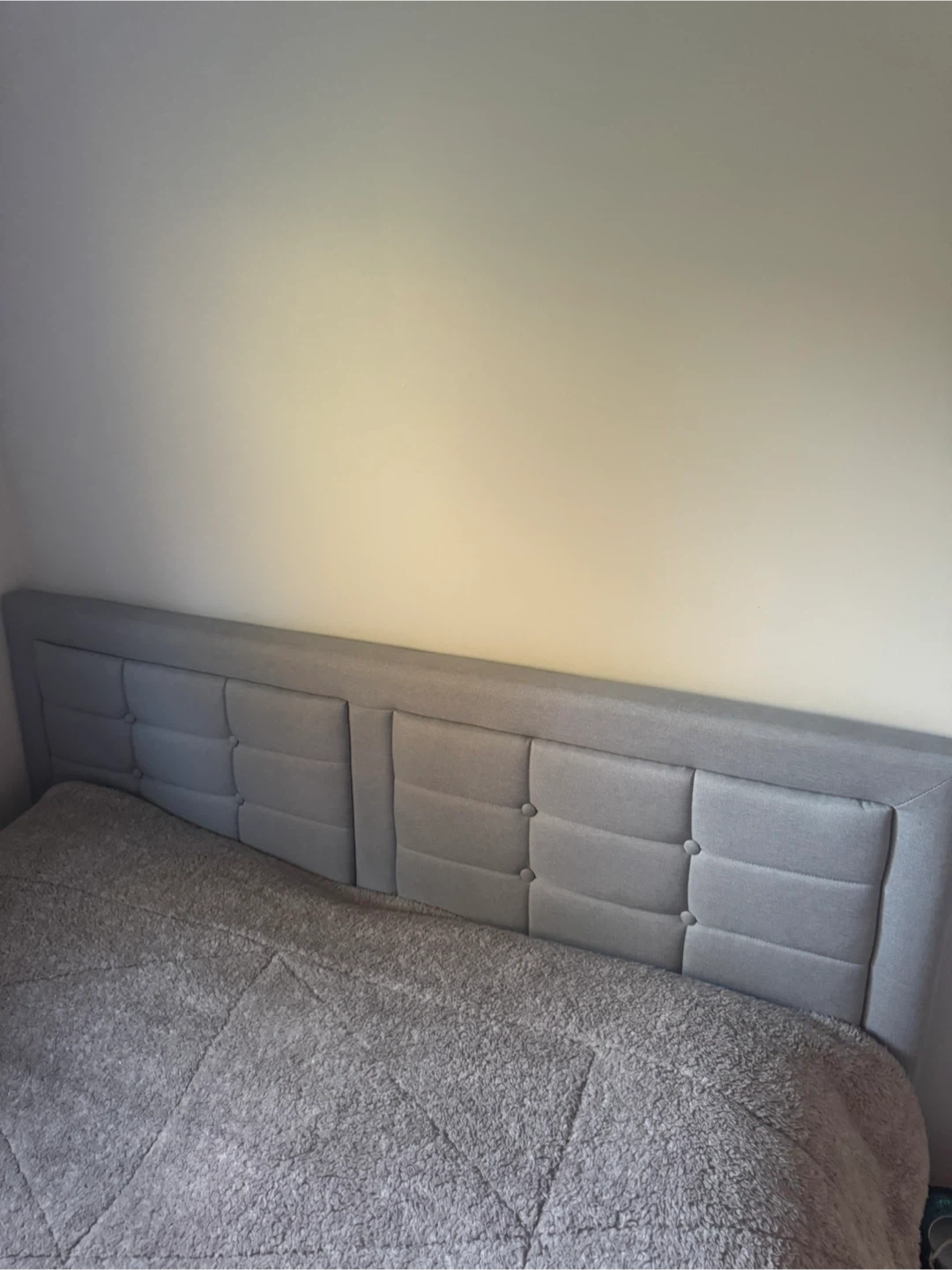 Selling a queen size bed frame with a stylish headboard.+ mastress.The bed frame is light grey and the mastress in new condition.never used Dimensions: - Length: 82.7 inches - Width: 60.4 inches - Height: 41-46.9 inches Perfect for a comfortable and modern bedroom setup