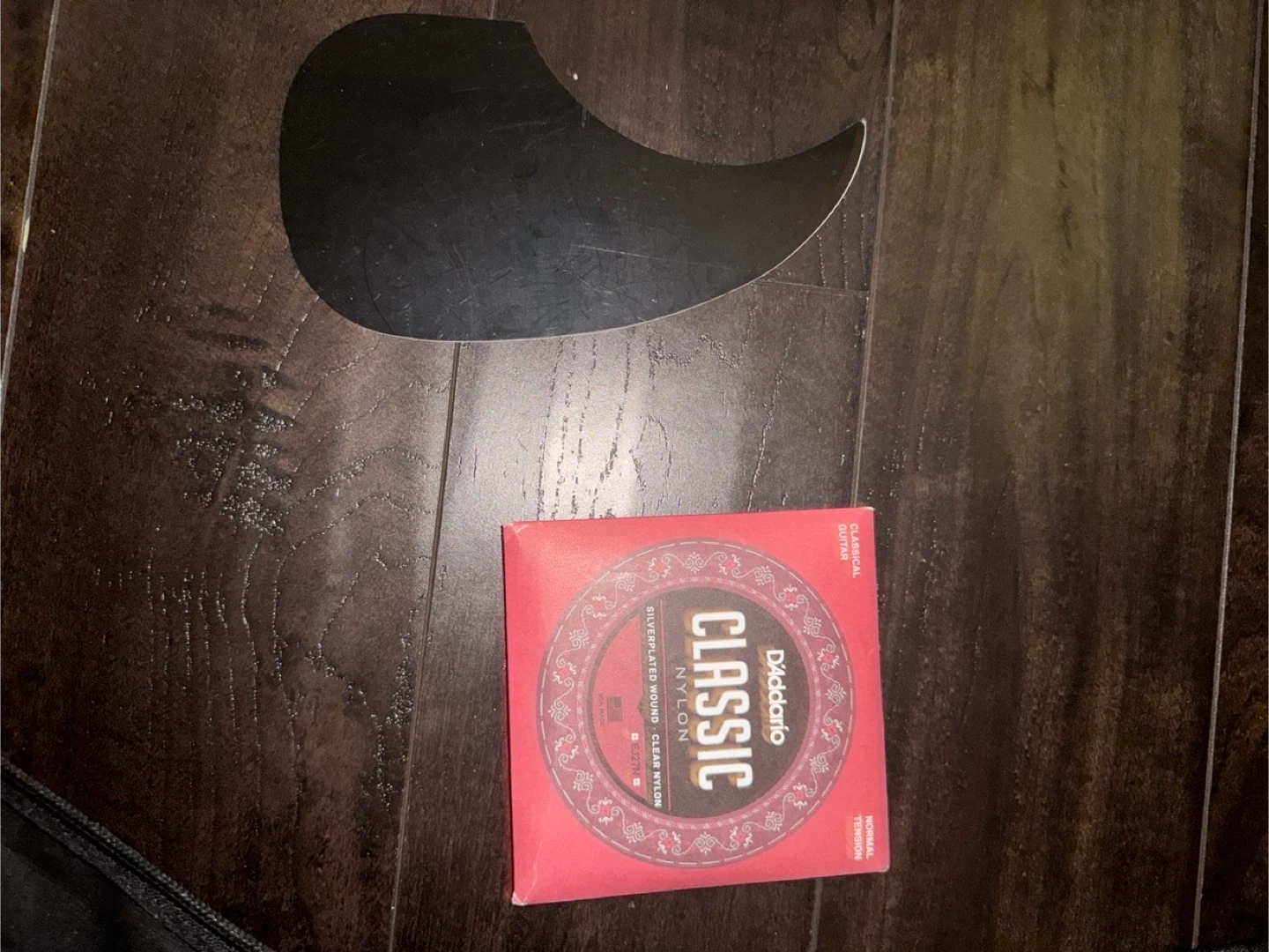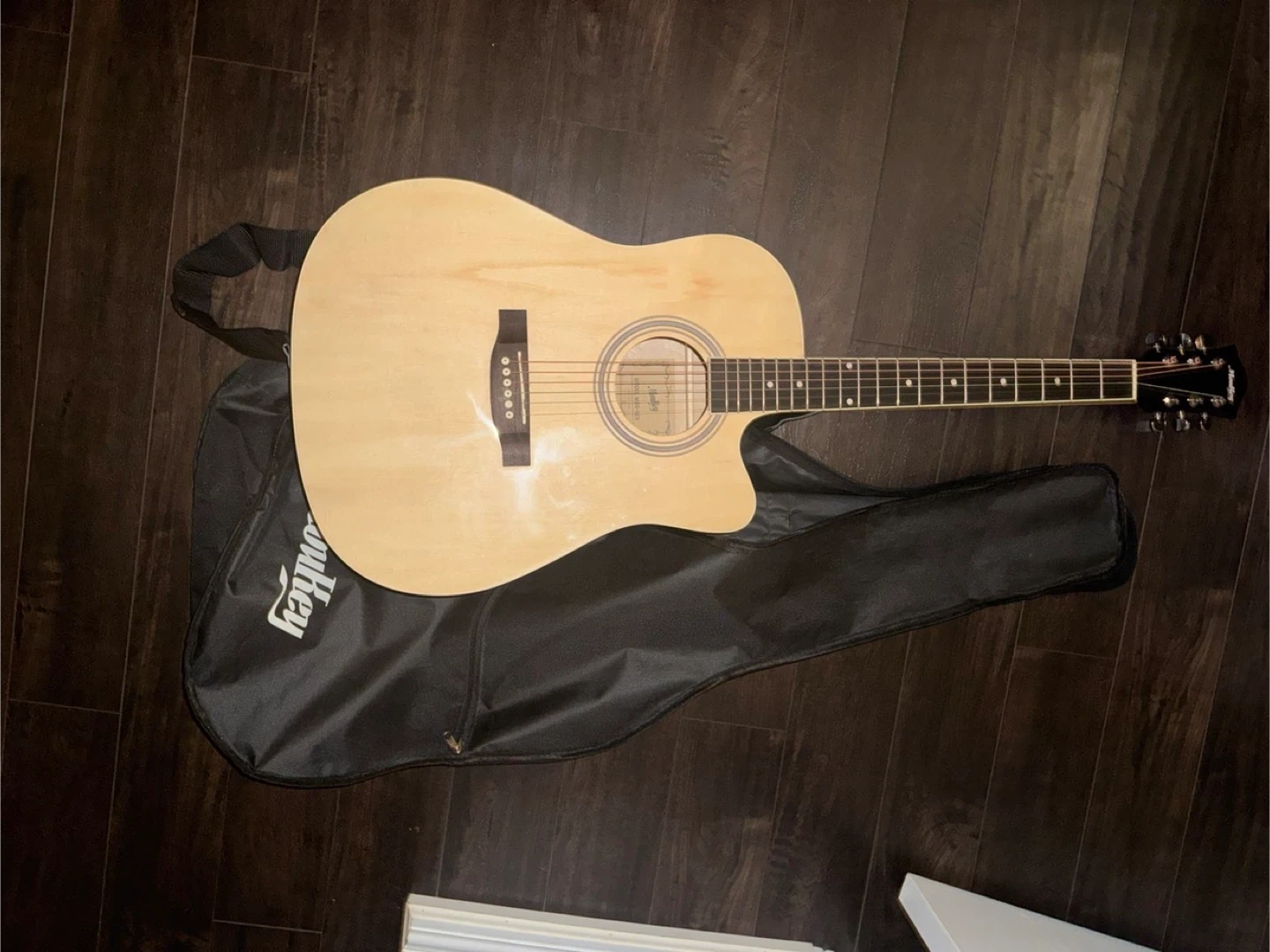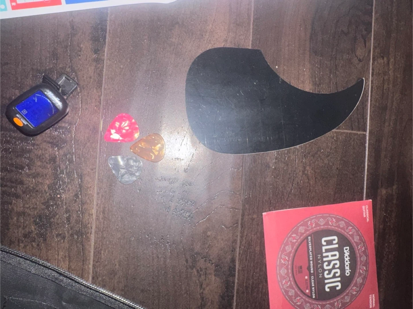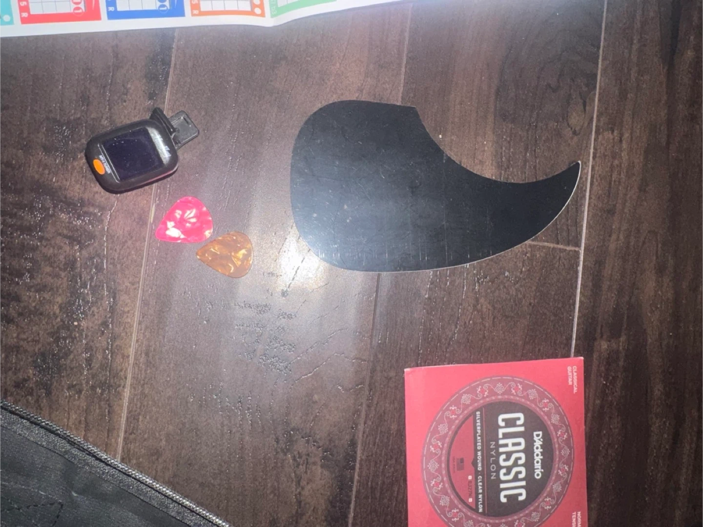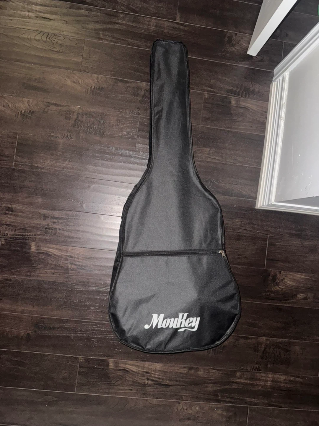 Selling a Moukey acoustic guitar. It comes with a case, guitar chords poster, a pick, and a pack of D'Addario Classic nylon strings. With extra strings picks tuner and capo (price is negotiable)