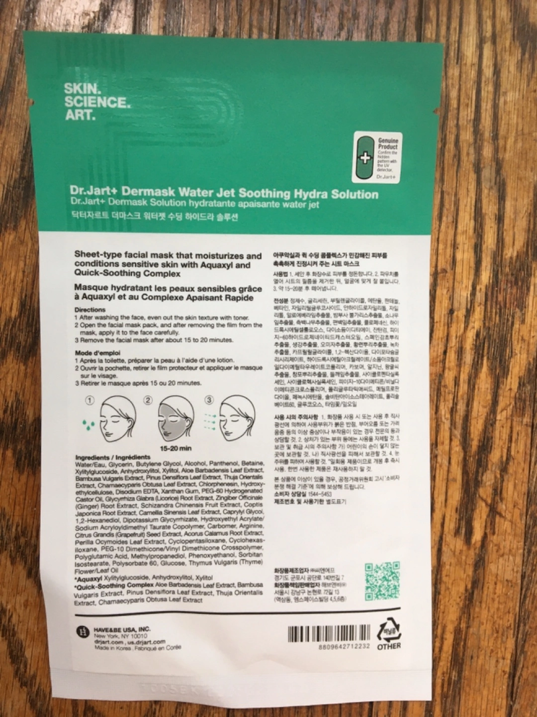 Selling a Dr.Jart+ Dermask Water Jet Soothing Hydra Solution sheet mask! This is a sheet-type facial mask that moisturizes and conditions sensitive skin with Aquaxyl and Quick-Soothing Complex. It's dermatologist tested and contains 25 g / 0.88 oz of product. Perfect for a little at-home spa day!