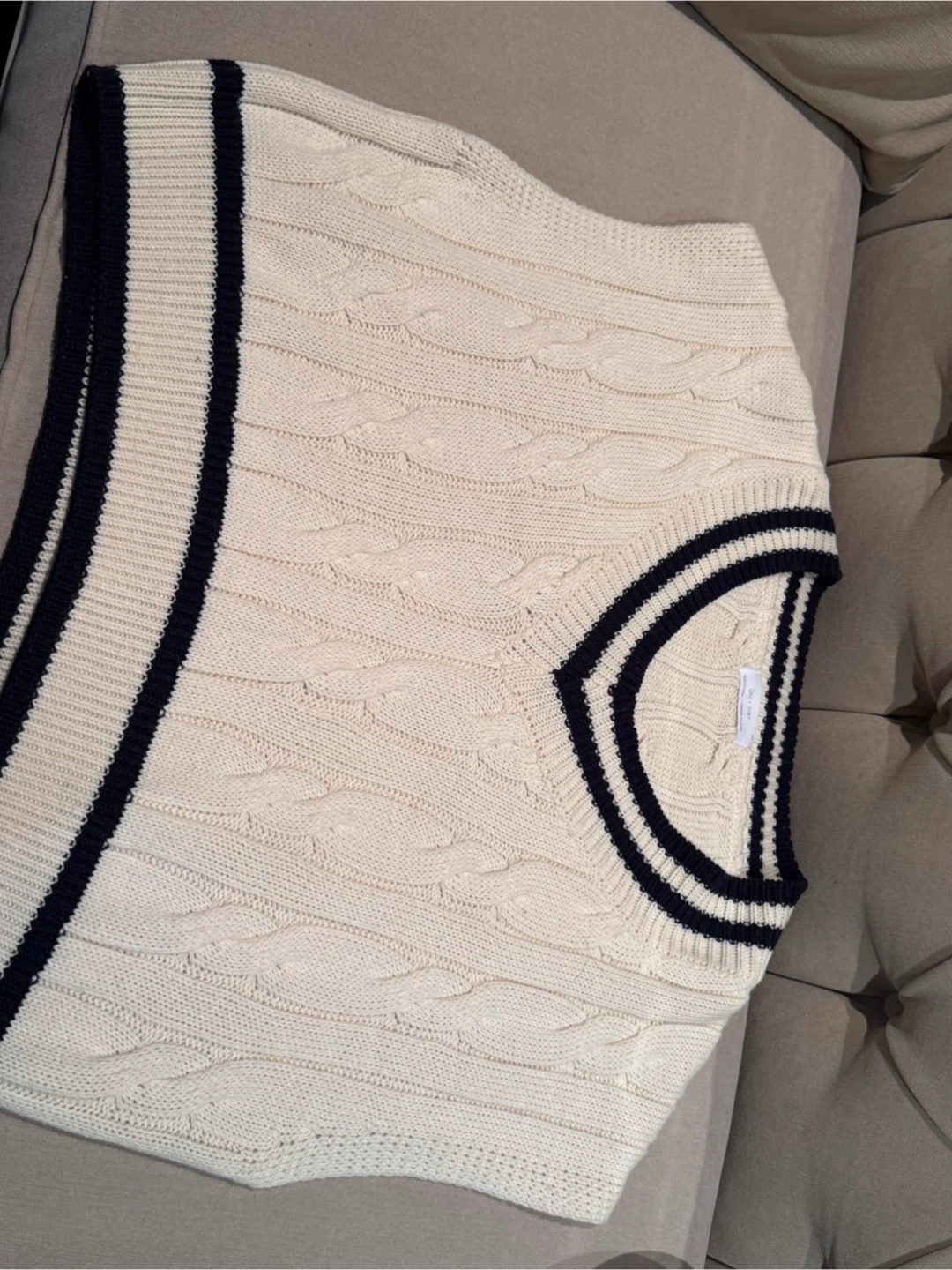 Cozy up with this cream-coloured cable knit sweater vest! It features a classic V-neck design with navy blue striped trim. Perfect for layering during the cooler months!