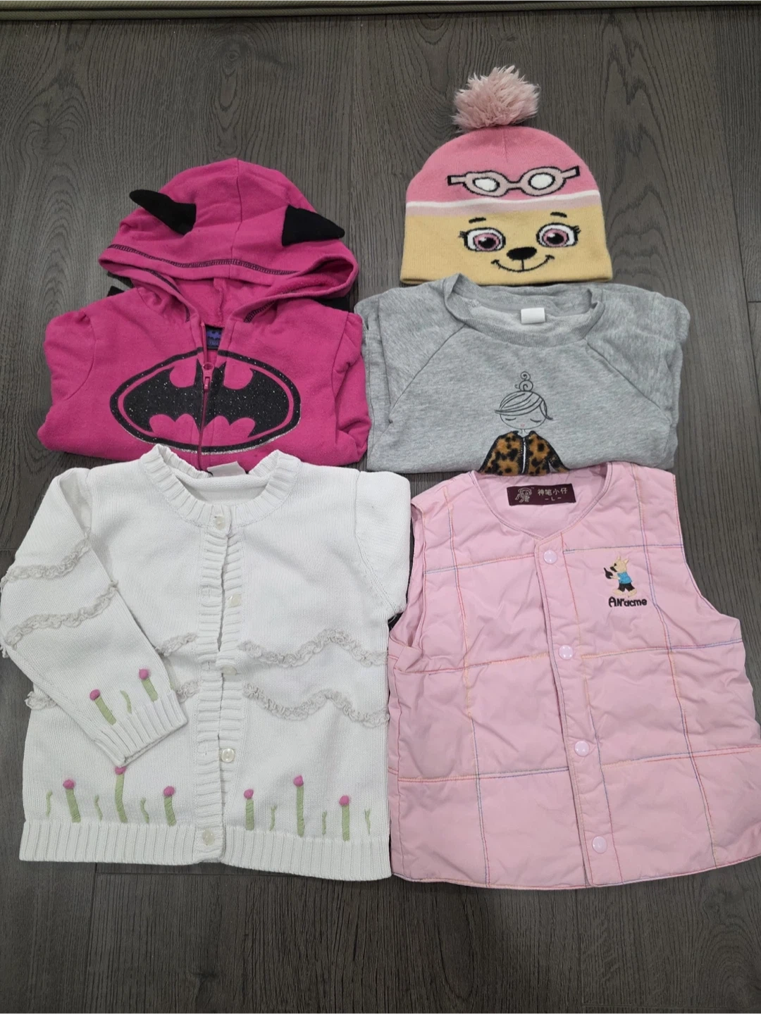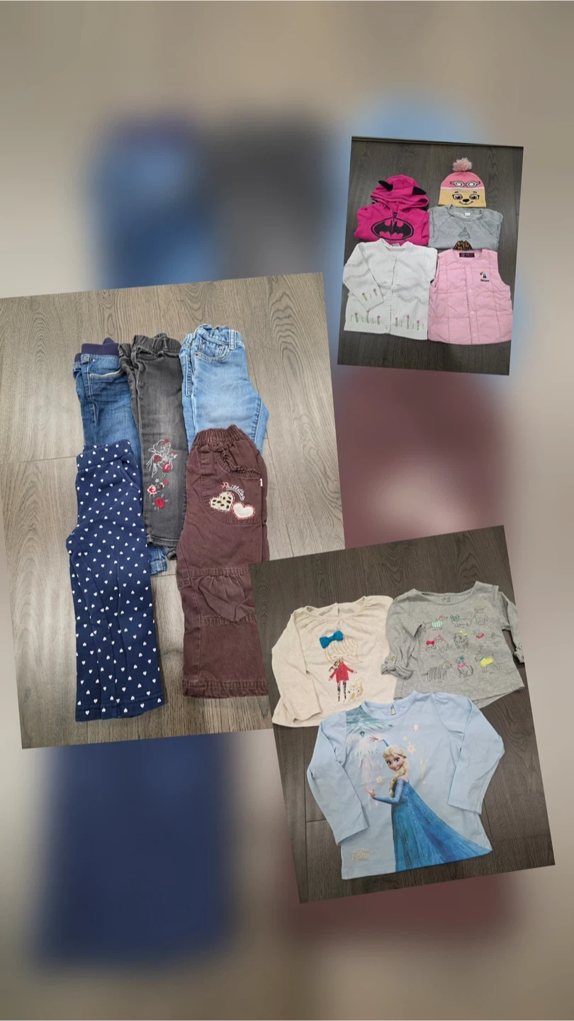 Selling a bundle of kids' clothing, including long-sleeve shirts, jeans, a cardigan, and a vest! 3 pyjama sets. sizes are 3-4 years old. All items are in good used condition.