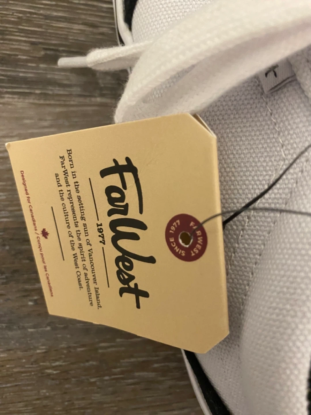 Selling a pair of FarWest Rope sneakers in black and white. They're a size 8 with a wide width. These sneakers are designed for Canadians and have a cool West Coast vibe! The tag shows they retail for $49.99 Pick up Sage Hill Pet and smoke free home Cash only Check out my other listings