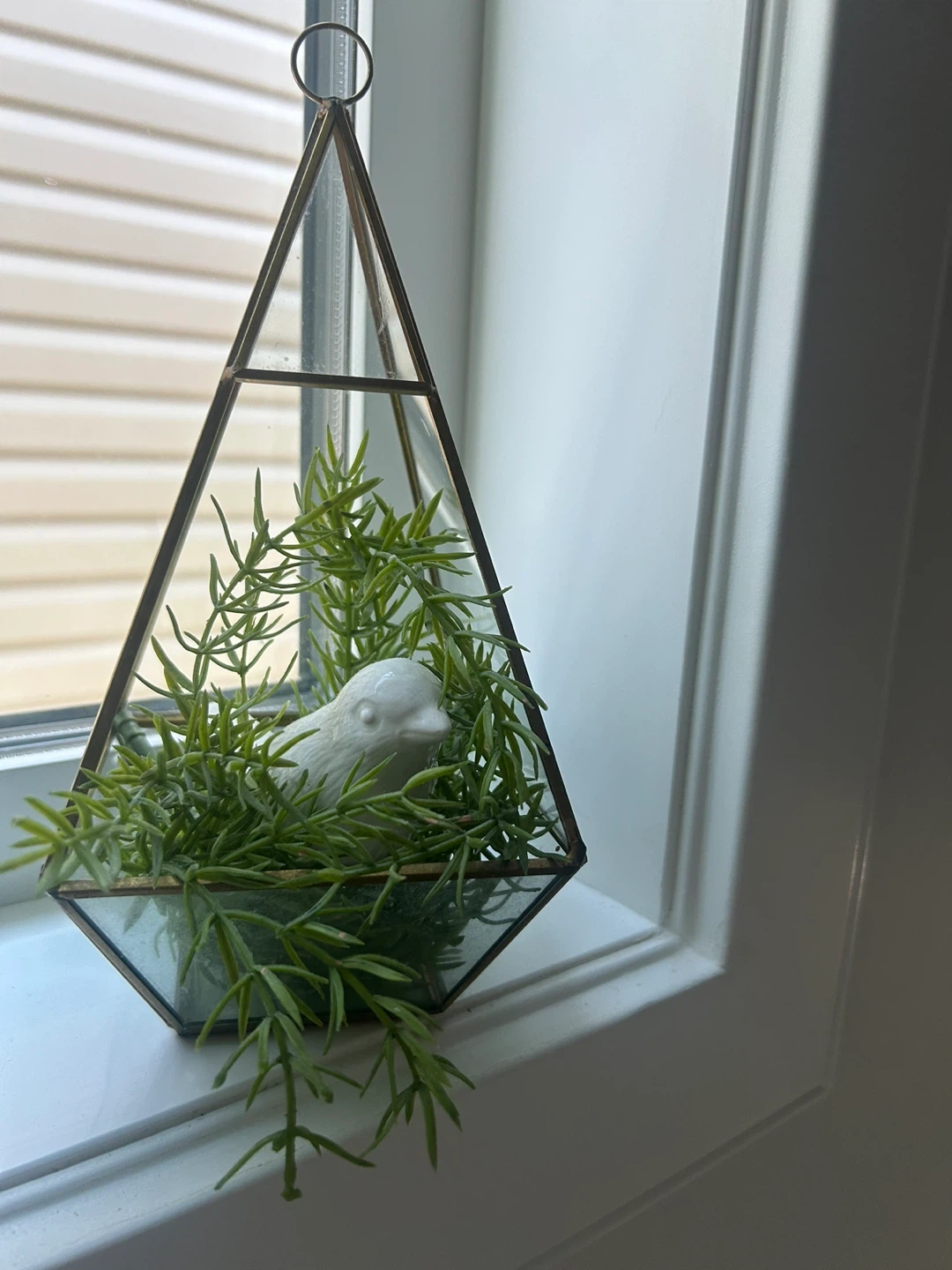 Cute terrarium with a little bird inside! It's in great shape and would look lovely on a windowsill or shelf. The greenery adds zen sanitary to any space in your home