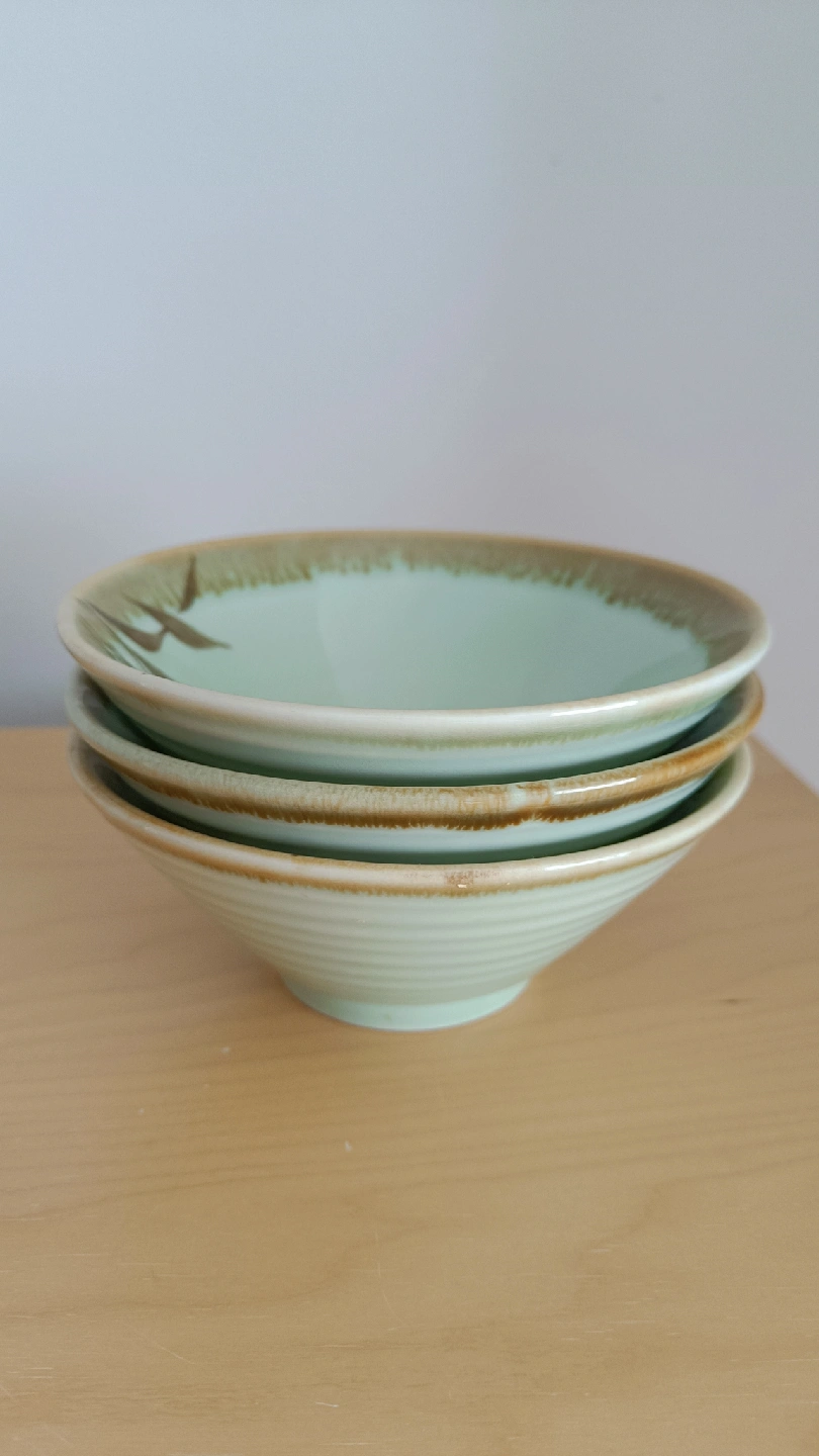 Selling a set of three light green bowls, perfect for everyday use! They have a nice, subtle design around the rim. Great for serving snacks or using as small serving dishes