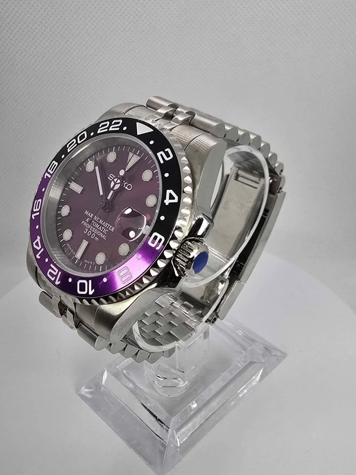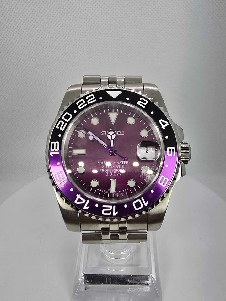 For sale Seiko Joker custom build. Reliable NH35 automatic movement Stainless steel case & bracelet Rotating black/purple bezel Sapphire crystal with cyclops date magnifier ✅ Condition: New/Unworn ✅ Price: $350 ✅ Local pickup in Scarborough or Downtown Toronto available Custom request available with a $100 dollar down payment to ensure commitment. 2-3 weeks lead time for custom builds depending on request.